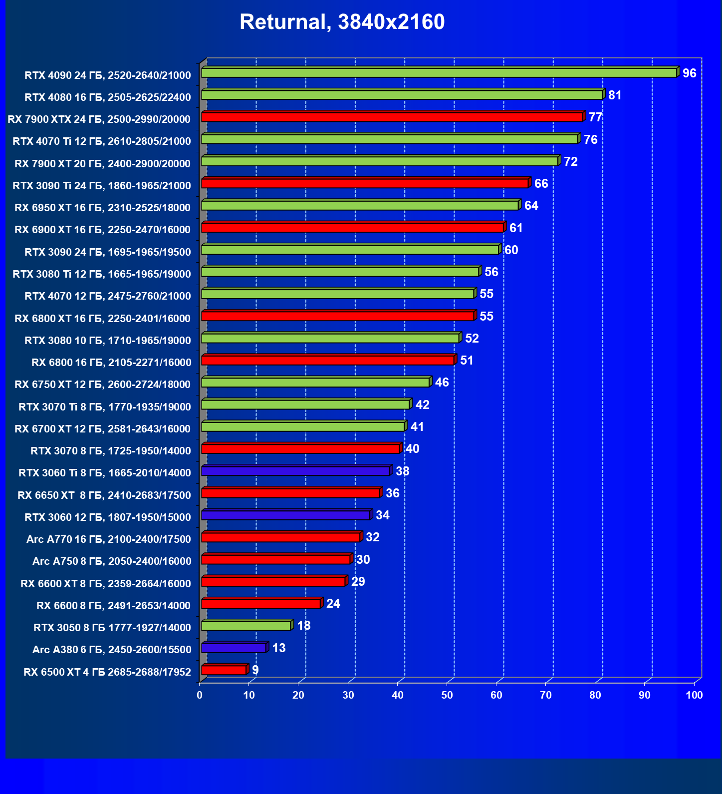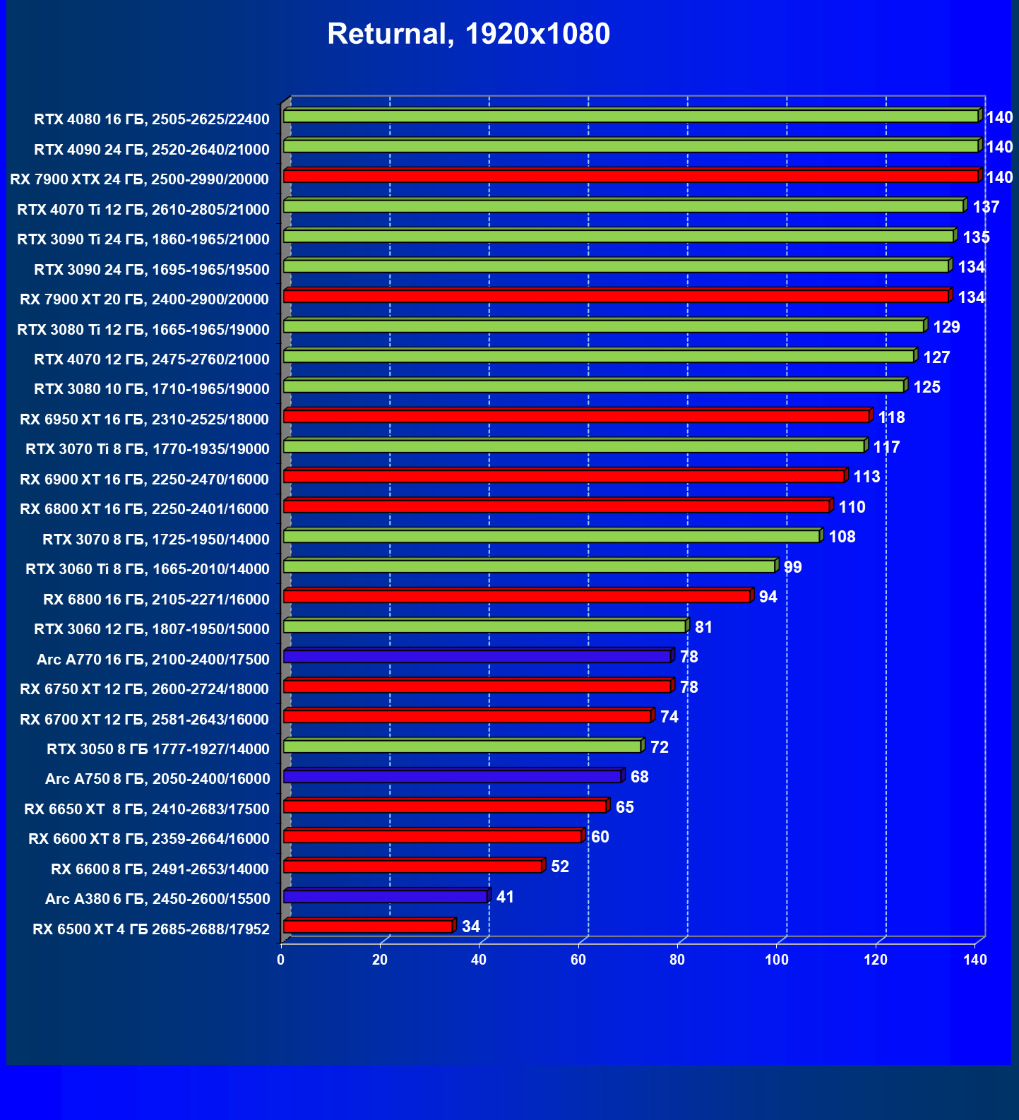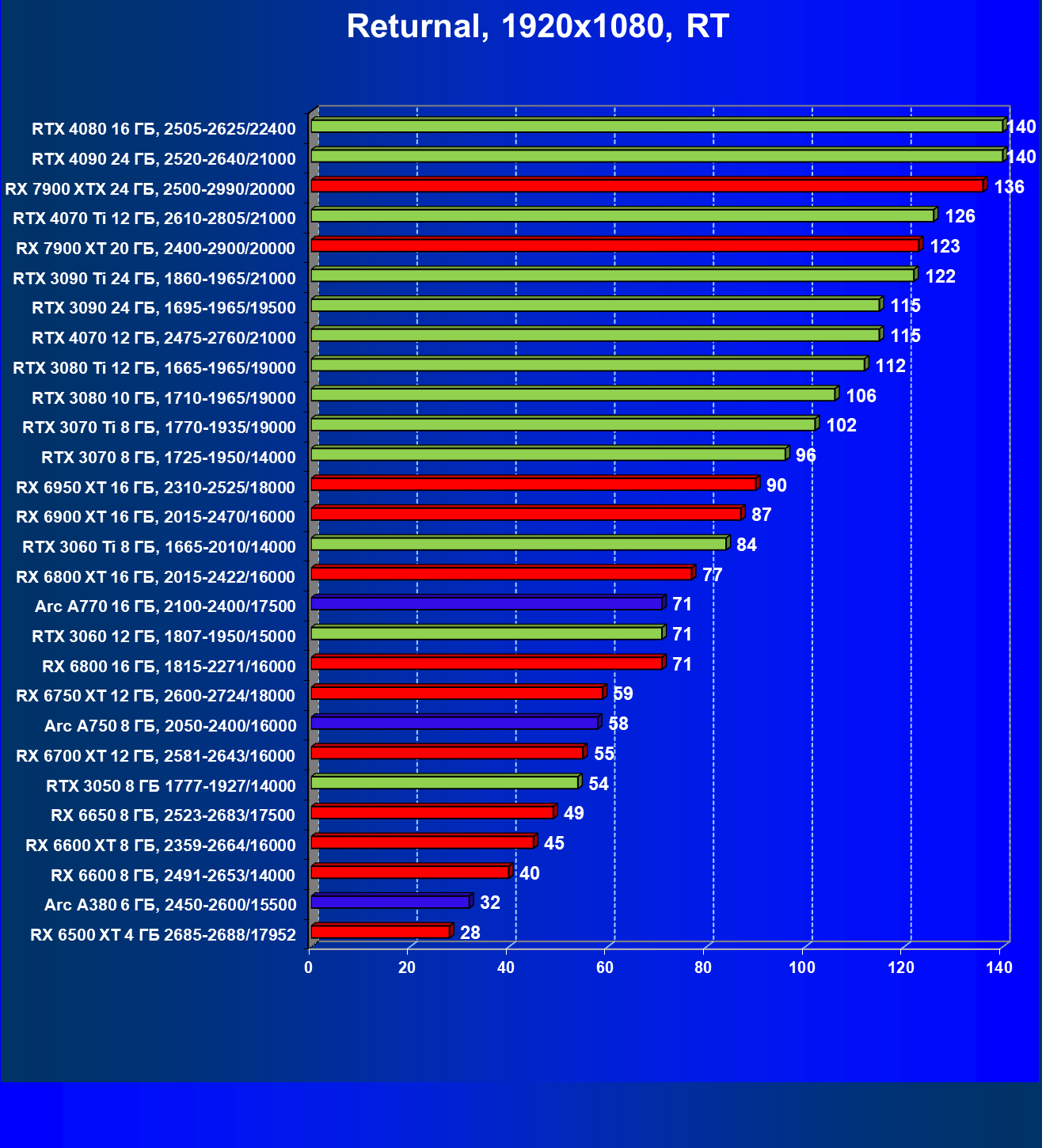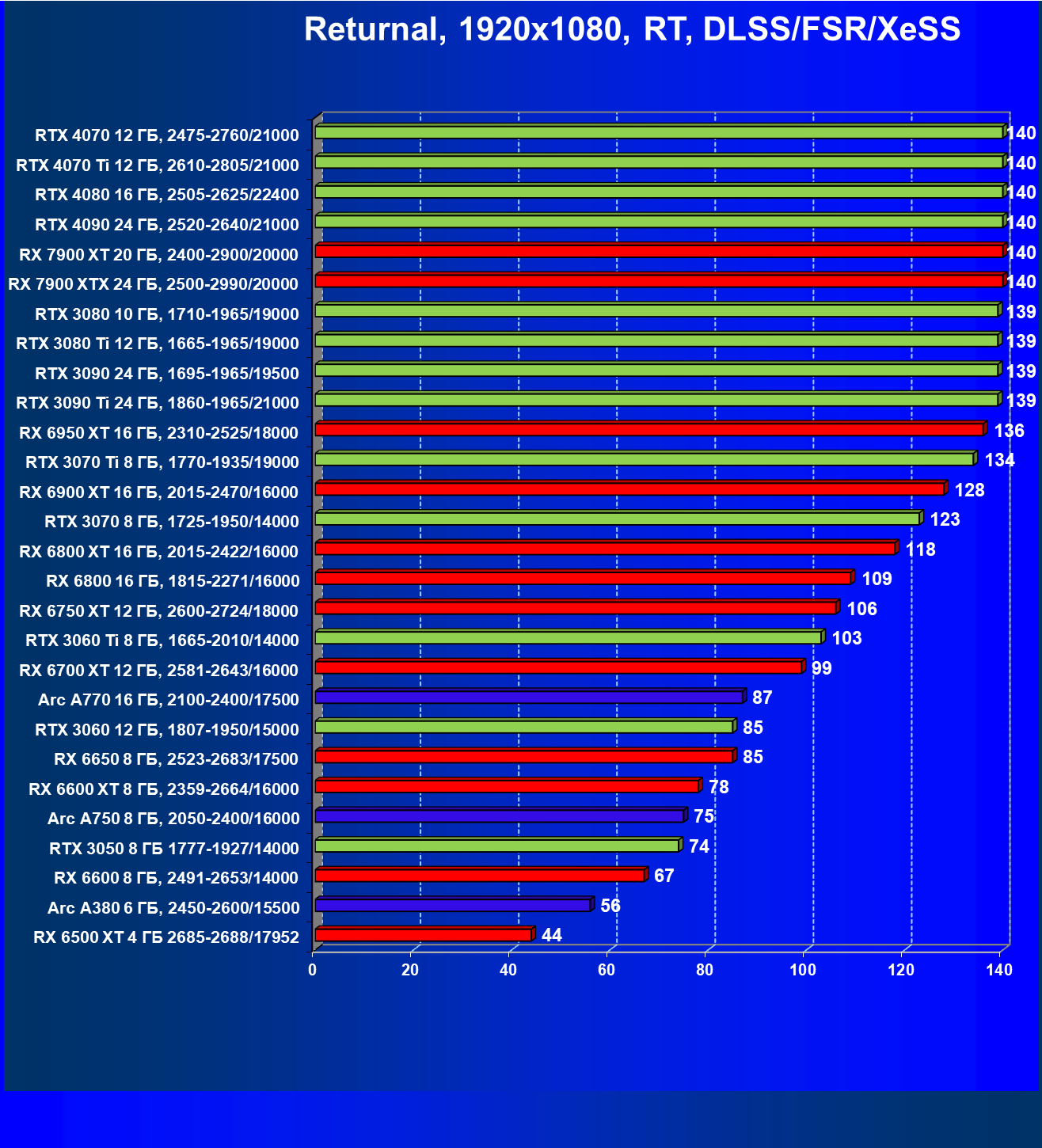Безусловно, эта, как и любая другая игра после своего выпуска обновляется, чтобы устранить «ляпы» и сделать игру еще красивее, добавив в нее современные технологии, что приводит к падению производительности на ультра игровых настройках графики на картах прошлых поколений. Данный обзор нацелен показать вам возможности трассировки лучей в этой игр: что приносит ее включение, и каким образом можно ощутимо повысить FPS на относительно бюджетных картах от производителей графических процессоров AMD, Nvidia или Intel. В игре Returnal для компенсации падения FPS от включения RT внедрены технологии масштабирования DLSS/FSR/XeSS, что позволяет повысить разрешение или поднять настройки графики владельцам бюджетных карт. Данный обзор так же демонстрирует производительность на современных из разного ценового сегмента картах.