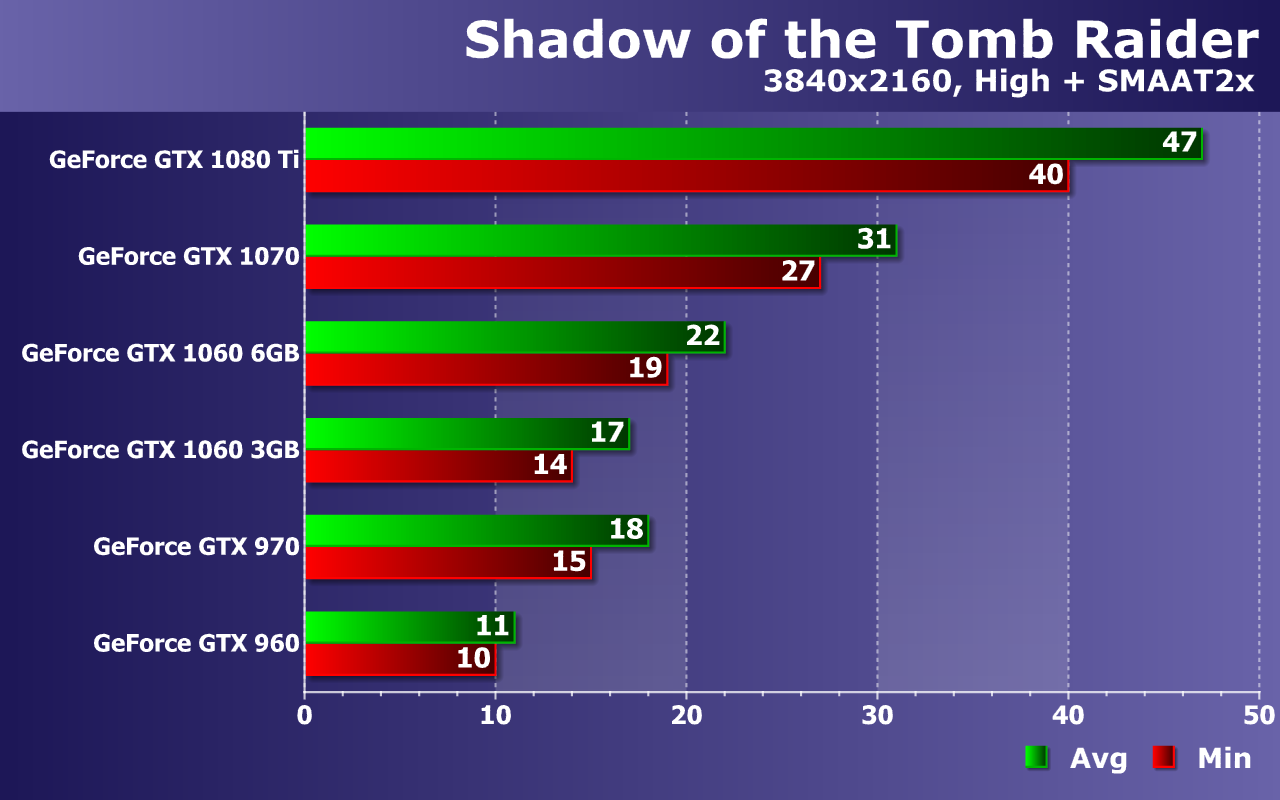 При высоких настройках и 4K-разрешении GeForce GTX 1070 и менее мощные видеокарты все так же не обеспечивают даже минимально достаточного уровня производительности, показывая уже менее 30 FPS. Даже нетребовательным игрокам с мониторами такого разрешения подойдет лишь топовая GeForce GTX 1080 Ti, показавшая 47 FPS в среднем при отсутствии падений частоты кадров ниже 40 FPS — терпимо, но далеко не идеально.