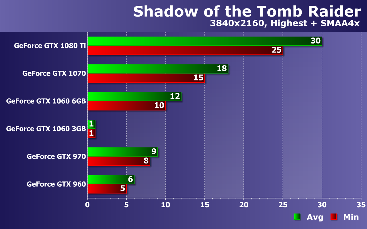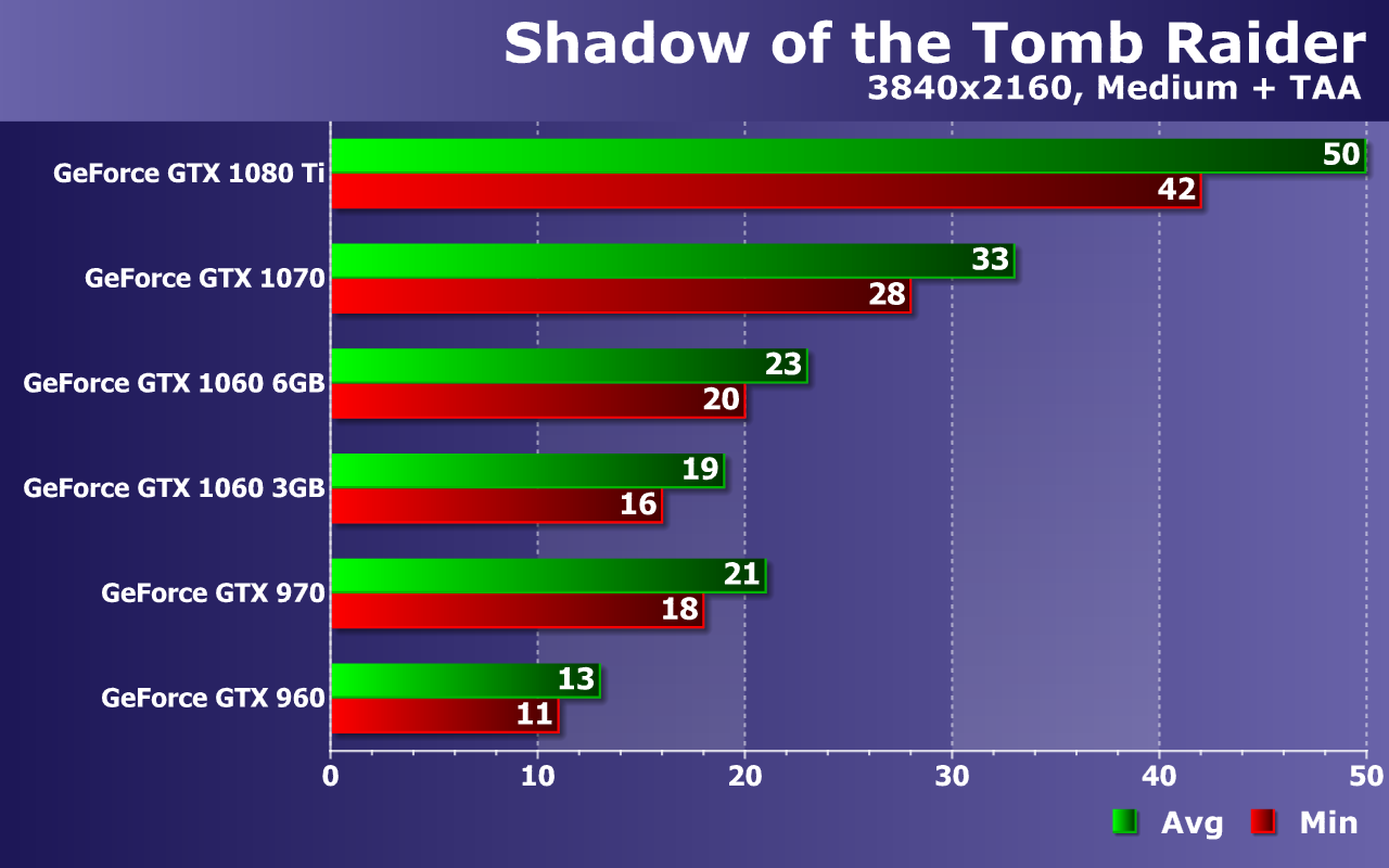 Но даже в ее нынешнем виде игра Shadow of the Tomb Raider достаточно требовательна к мощности графических процессоров, если говорить о высоких графических настройках и разрешениях. С Full HD же неплохо справляется даже такое не слишком мощное решение, как GeForce GTX 960, обеспечивающее играбельную частоту кадров при средних настройках. Но производительность рассматриваемой игры слишком сильно зависит от разрешения рендеринга, и даже в WQHD-разрешении игрокам потребуются решения как минимум уровня GeForce GTX 1060 или топовые видеокарты предыдущих поколений, обеспечивающие достаточно высокую плавность видеоряда в этом случае — но лишь при средних настройках.