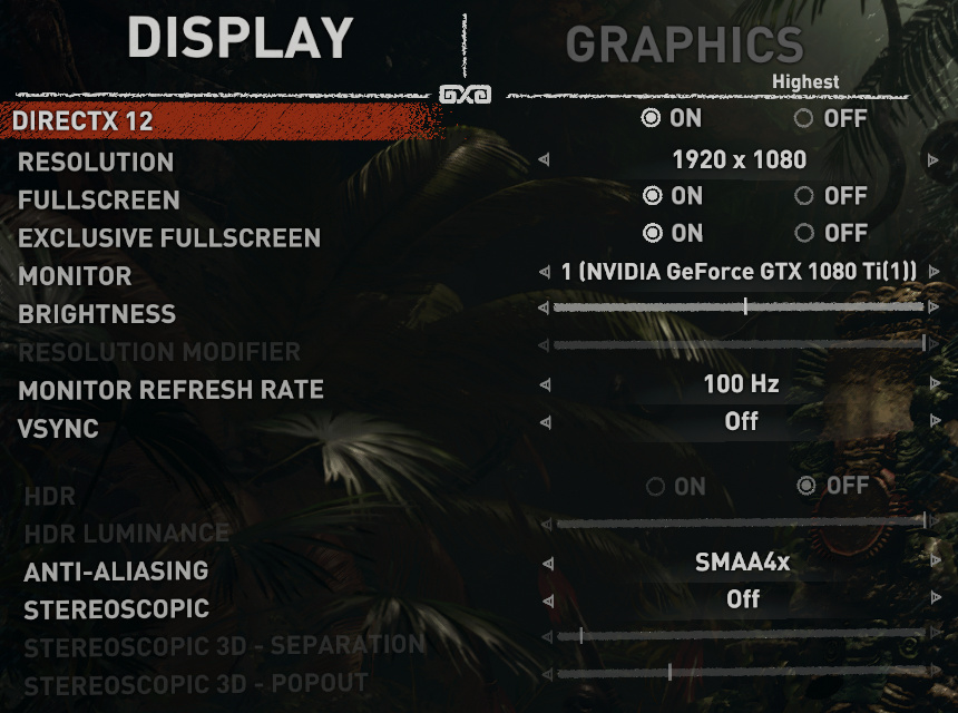 В основном графическом меню можно изменить используемую версию графического API DirectX, разрешение экрана, режим вывода (полноэкранный или оконный), настроить яркость и частоту обновления экрана, выбрать метод вертикальной синхронизации, настроить HDR-монитор и стереовывод, а также выбрать метод полноэкранного сглаживания: SMAA, TAA, SMAAT2x и SMAA4x. Что касается HDR-режимов, то в Shadow of the Tomb Raider есть поддержка G-Sync HDR мониторов и других HDR-дисплеев, которые способны улучшить качество при помощи увеличения контрастности и количества цветовых оттенков.