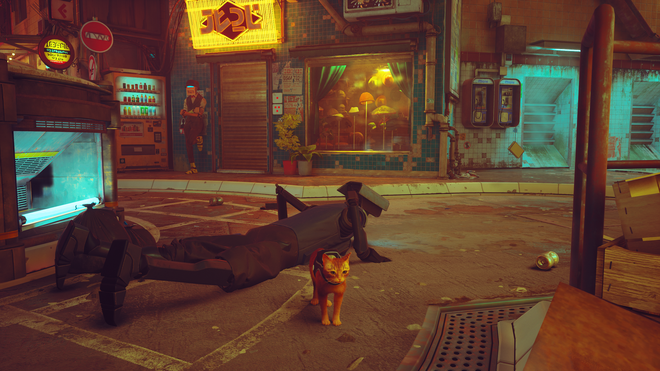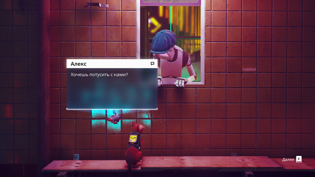 Роботы переняли все повадки людей, это восхищает, такого явно не ожидаешь в игре про котейку и роботов. Уже круто встретить обычные бары и магазины в городе, где выживали люди, и теперь существуют роботы. Бежишь по сюжету выполнения заданий, и из окна робот зазывает тебя «потусить» без какого-либо «фейсконтроля», и к удивлению лексикон такое знает, нет бы позвать активно подвигаться, а зовут именно «потусить». В этом «робоклубе» мы увидим не только соответствующее освещение, но и диджеев.