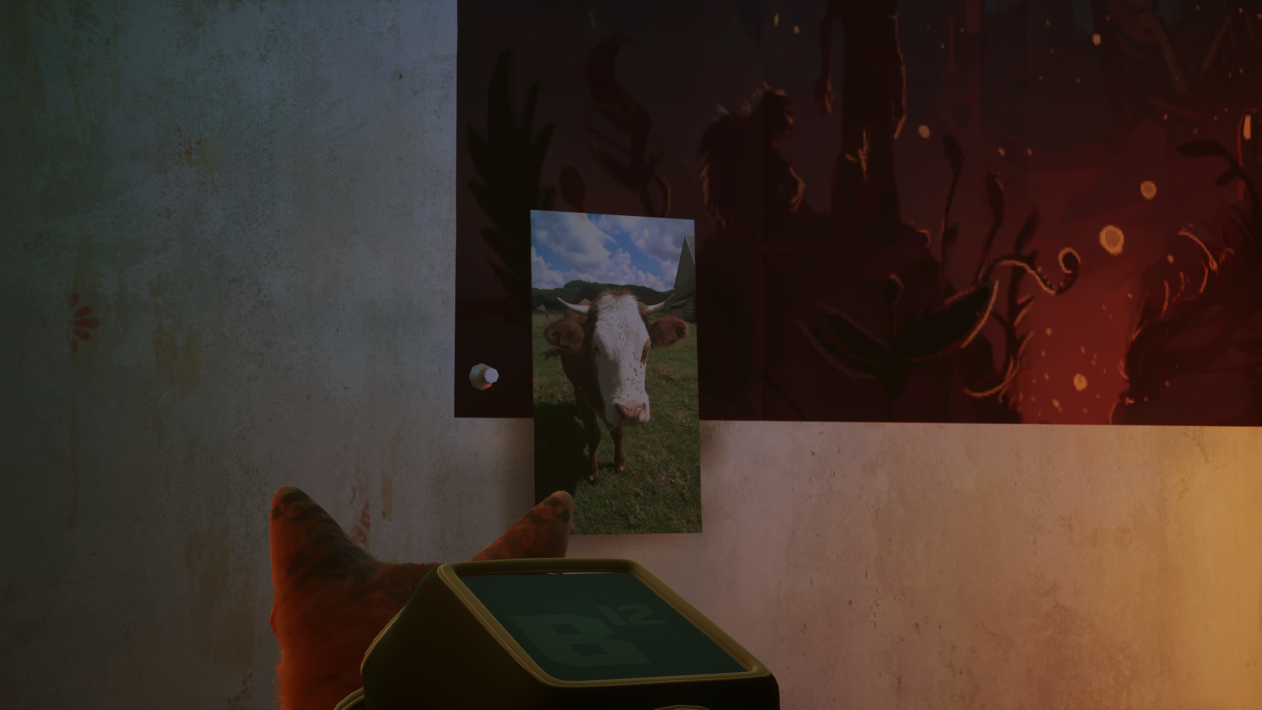 Кошачья игра Stray разработана командой с юга Франции, состоящая главным образом из котов -)) и нескольких людей в придачу -)), и в игре в некоторых местах можно обнаружить коробки, повествующие о местонахождении создателей игры, при этом рядышком мы снова можем обнаружить фото коровки на поле, я же говорил, что, собственно, они развешены почти везде.