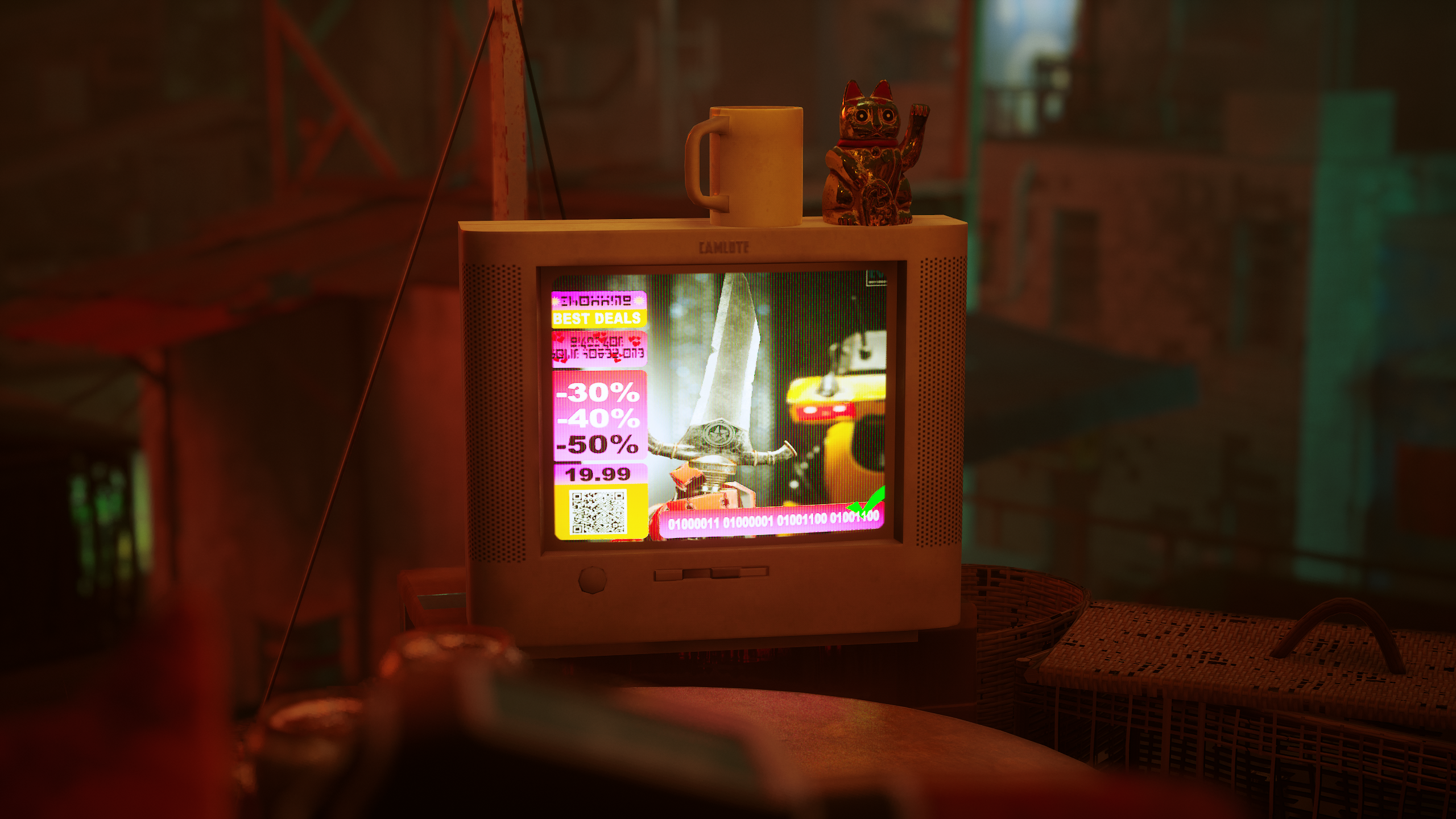 На крышах города можно обнаружить телевизор, с помощью находившегося на диване пульта можно пощелкать каналы, одни из которых местные новостные, другие — с местной рекламой продаж каких-то «девайсов» со скидками и номерами для связи с продавцами.