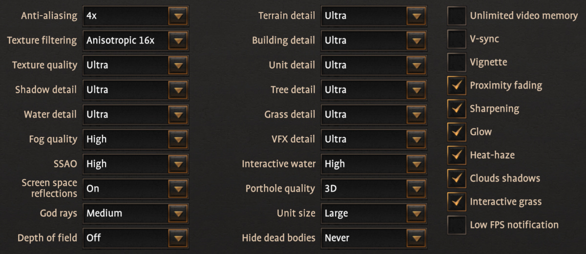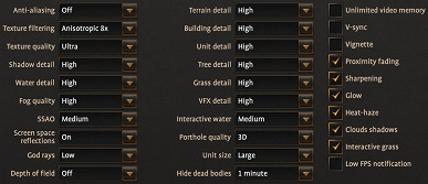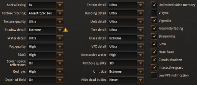 А вот профиль Ultra в игре довольно спорный уже потому, что он добавляет использование ресурсоемкого метода сглаживания MSAA, который весьма негативно сказывается на производительности, не давая такого же значительного эффекта в картинке. Также удивительно, что переход с настроек High до Ultra не изменяет размера отрядов, при обоих профилях выставляется Large, хотя есть еще Ultra и Extreme. Но эти значения в принципе рекомендуются лишь для самых мощных систем, и больше всего это касается CPU.