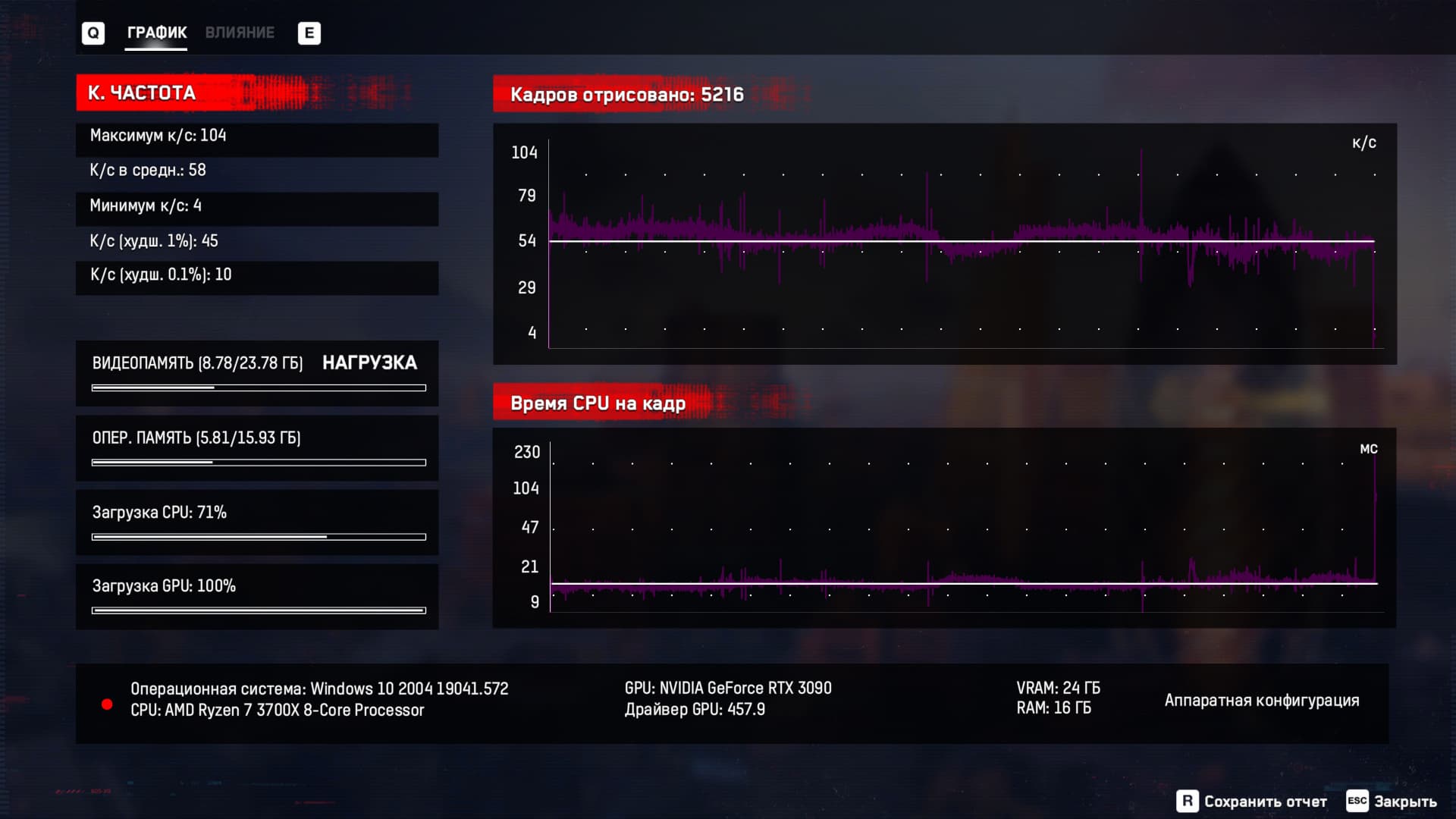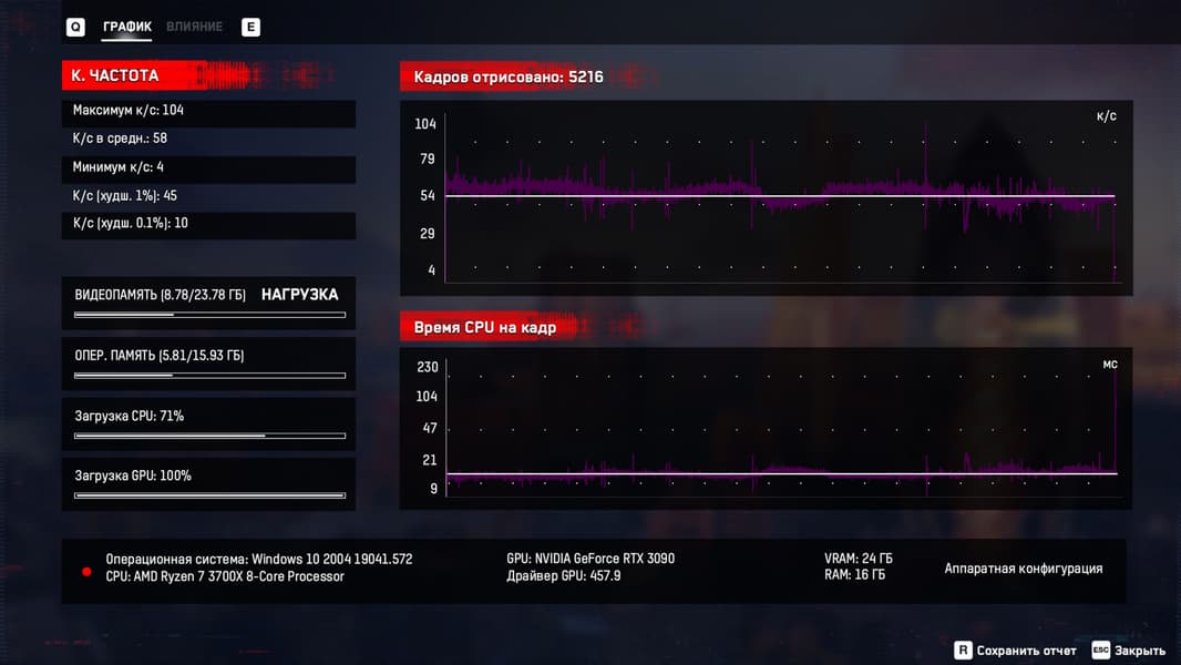 В конце тестирования выводятся подробные графики мгновенной частоты кадров и времени рендеринга кадра, с информацией о частоте кадров (минимальной, максимальной, средней, в худших 1% и 0,1% кадрах), но увы — только в целочисленном виде, что не совсем удобно. Также дается информация о загрузке видеопамяти и оперативной памяти, а также средней нагрузке на CPU и GPU, что полезно для выявления узких мест.