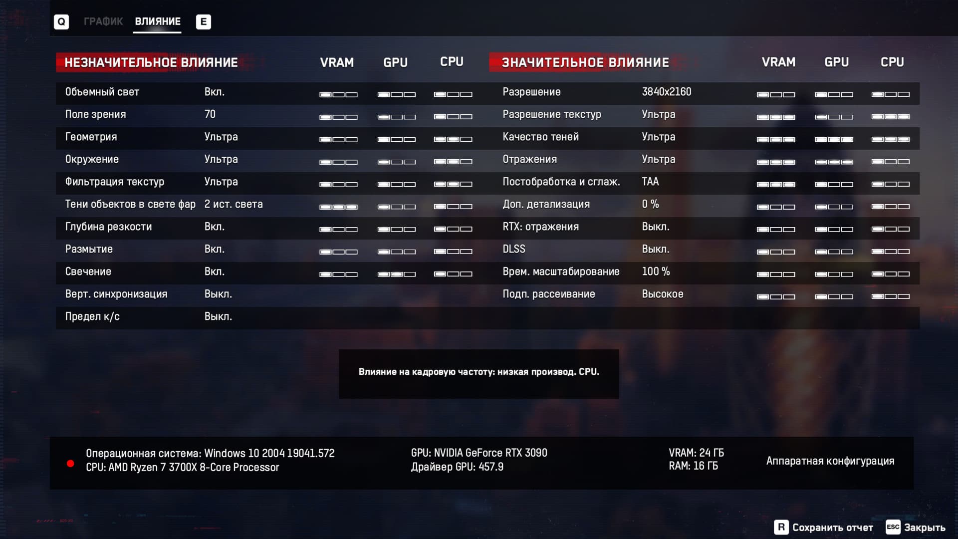 Есть тут и краткая системная информация с основными характеристиками системы, а на второй странице можно подробно посмотреть настройки графики, при которых проходил тест, а также их влияние на занятую видеопамяти и загрузку CPU и GPU, что можно использовать при тонкой настройке игры под конкретную систему.