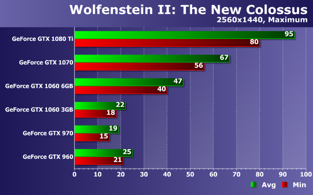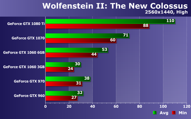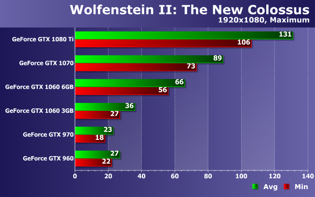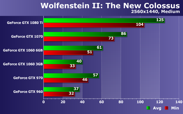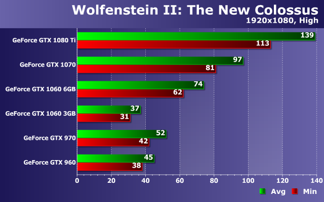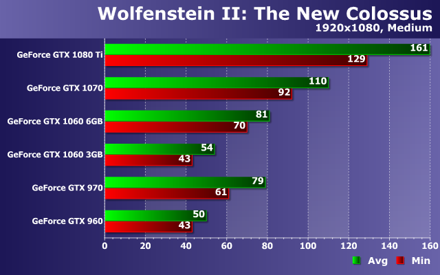 Младшая модель предыдущего поколения GeForce GTX 960 при средних графических настройках и разрешении Full HD показала приемлемую скорость рендеринга — 50 FPS в среднем и без падений частоты кадров ниже 30 FPS. Удивительно, но вариант GeForce GTX 1060 с 3 ГБ видеопамяти ушел недалеко (мы перепроверяли результат) — похоже, что игра Wolfenstein II: The New Colossus крайне требовательна к объему видеопамяти. Более мощные видеокарты в самых простых условиях смогли обеспечить в игре максимально комфортную частоту кадров, на всех из них минимальное значение FPS никогда не опускалось ниже 60 FPS, что подойдет даже самым требовательным пользователям.