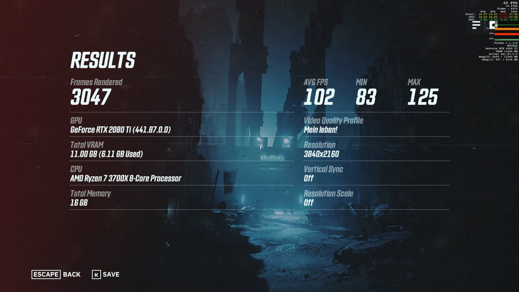 Мы очень рады тому, что в игре после всех патчей появился встроенный бенчмарк, предназначенный для тестирования производительности Wolfenstein: Youngblood, который неплохо отражает реальный игровой процесс, да еще и сразу в двух вариантах. Хотя в процессе игры встречаются и более требовательные локации, но выбранные разработчиками две вполне достаточны, так как они охватывают как сцены внутри помещений, так и снаружи. Самое главное, что действие в кадре от одного прогона к другому не меняется, и повторяемость результатов в итоге получается высокая.
