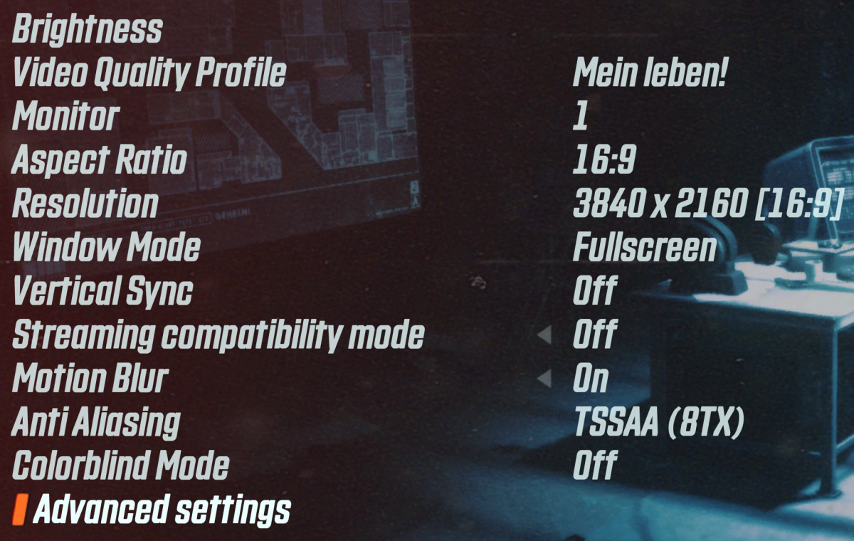 Можно выбрать предустановленный профиль настроек или пользовательские настройки (Custom). Профили настроек качества, имеющиеся в игре, почти все типичные: Low, Medium, High, Ultra, но есть и дополнительные Uber и Mein leben! Мы использовали традиционный для наших тестов набор: средние, высокие и... Mein leben!, так как ультра-настройки в этой игре очень слабо отличаются от высоких. А вот самые низкие настройки дают возможность поиграть владельцам даже очень слабых систем.