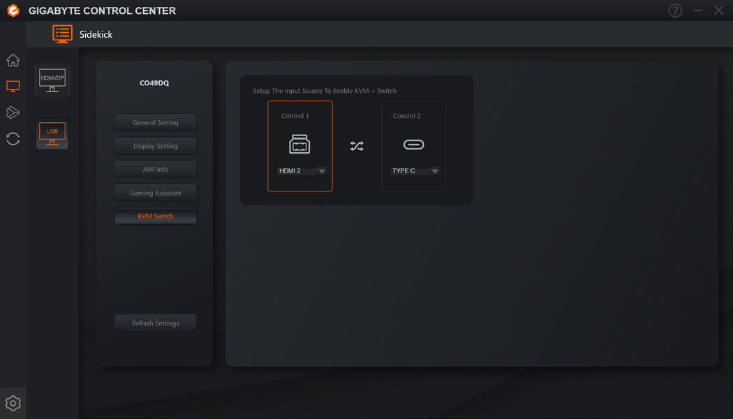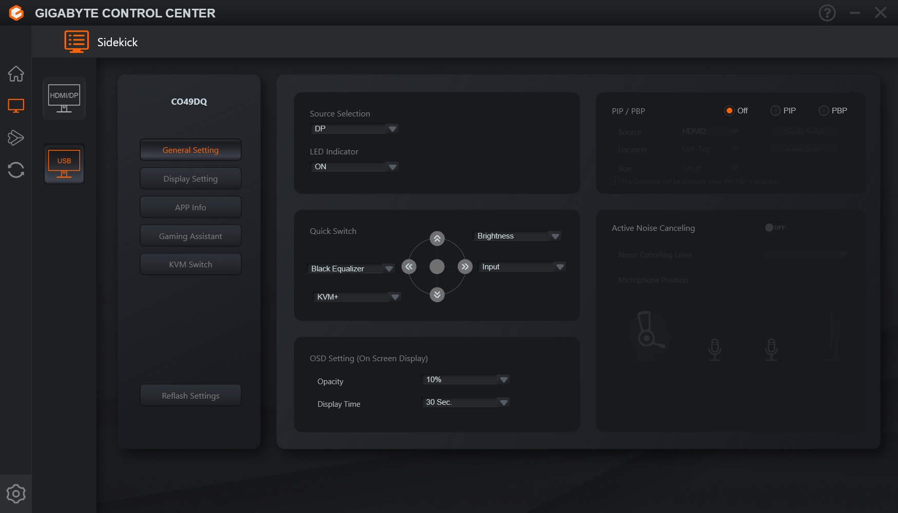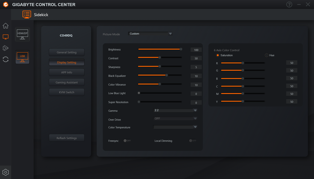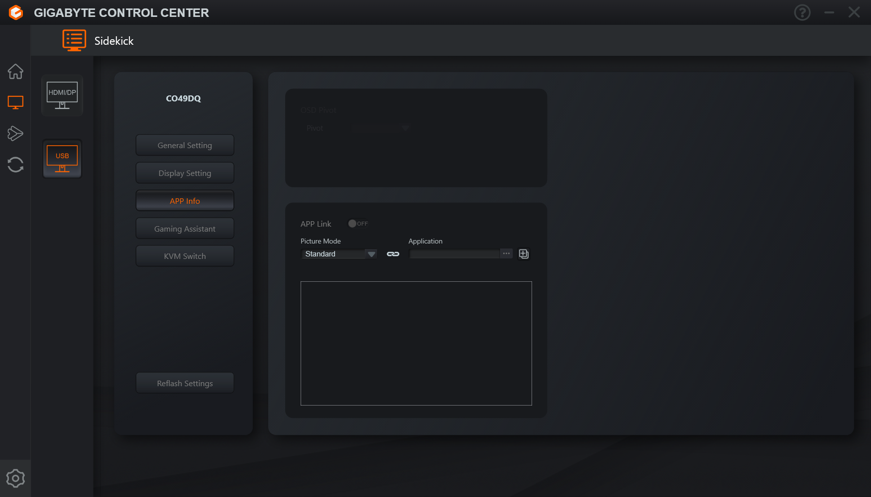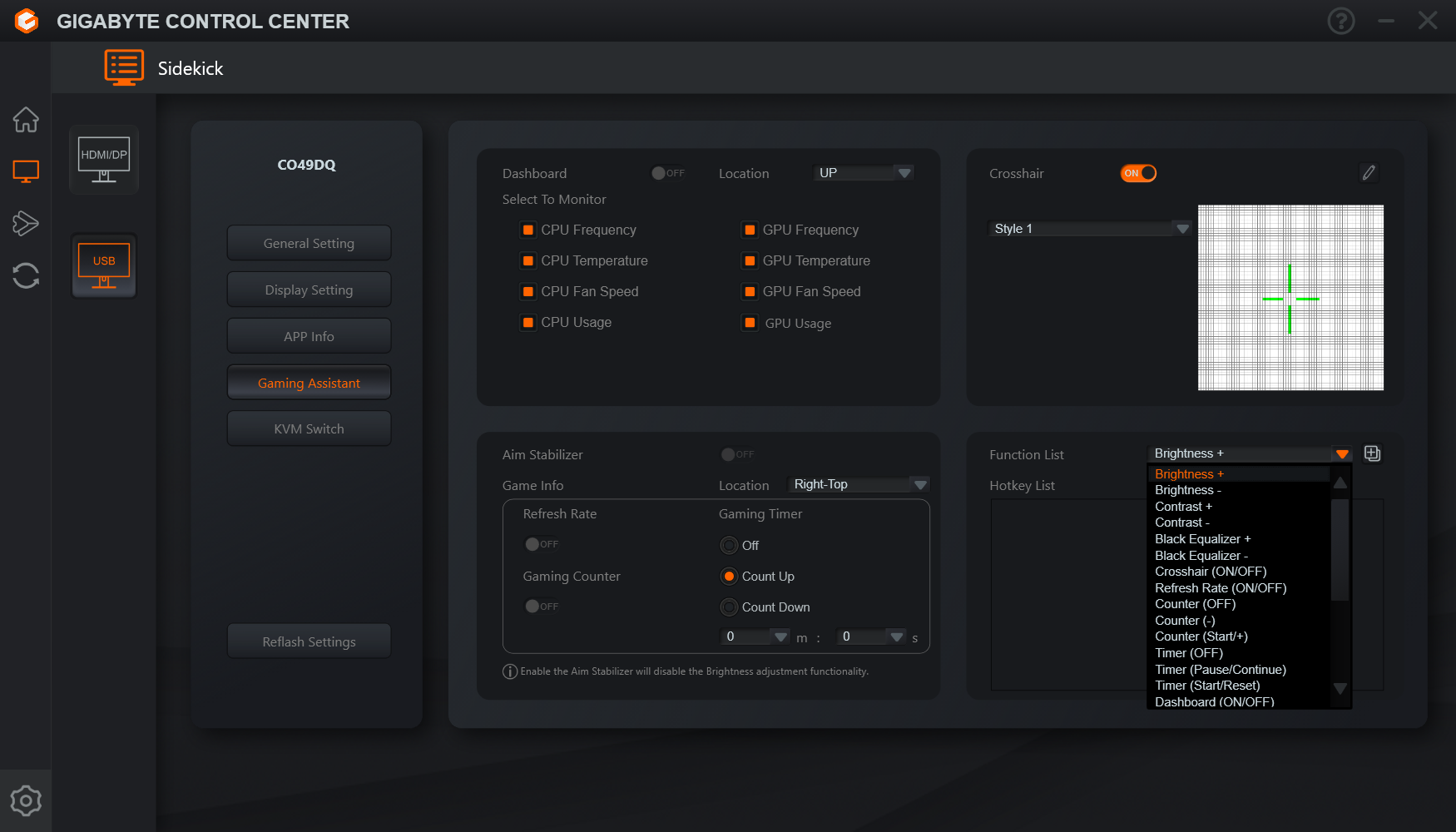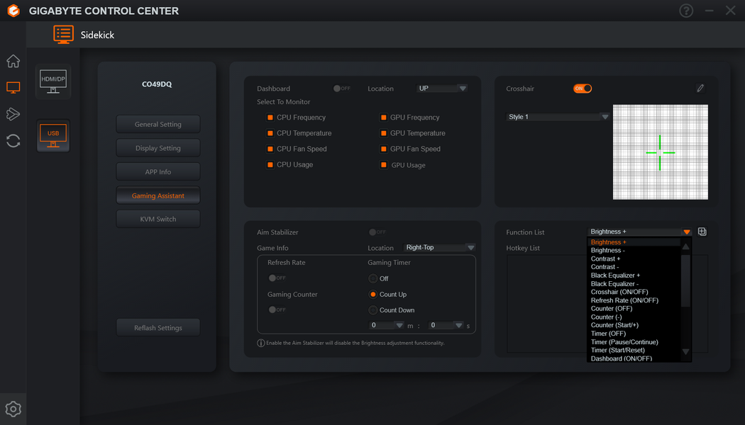 Монитором можно управлять с ПК с помощью фирменного ПО Gigabyte Control Center на вкладке Sidekick. Кроме настроек, доступных из меню монитора, в этом ПО можно задавать клавиатурные сокращения для ряда настроек и привязывать профиль с настройками монитора к активному приложению. Только при запущенной Gigabyte Control Center на монитор выводятся данные на панель Dashboard. И именно в Sidekick задаются клавиатурные сокращения, которым пользователь может увеличивать и уменьшать значение пользовательского счетчика. Что им полезно будет считать — зависит от игры.