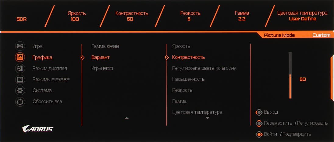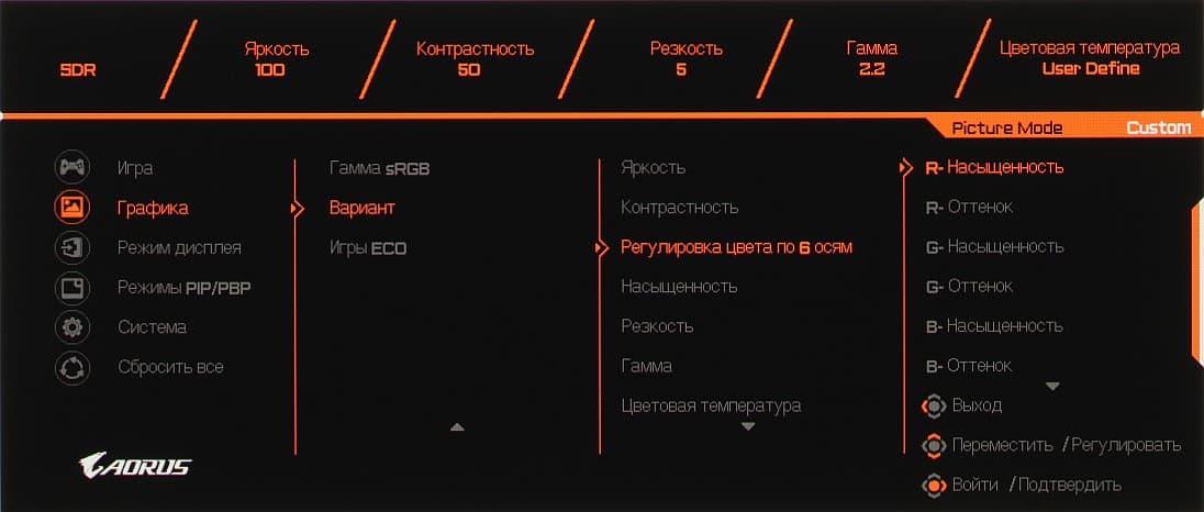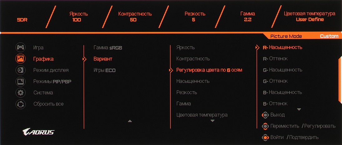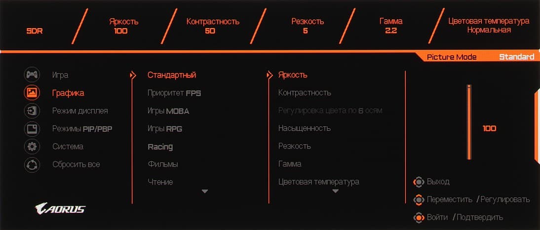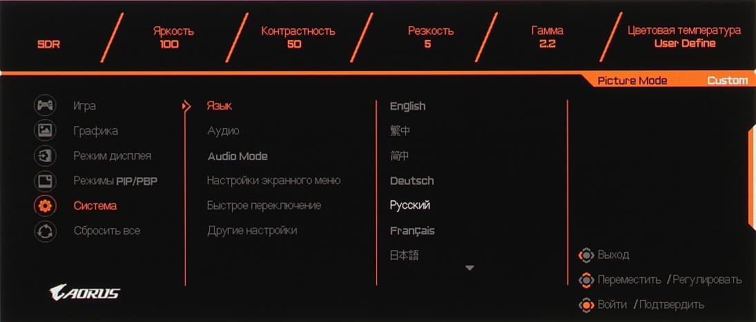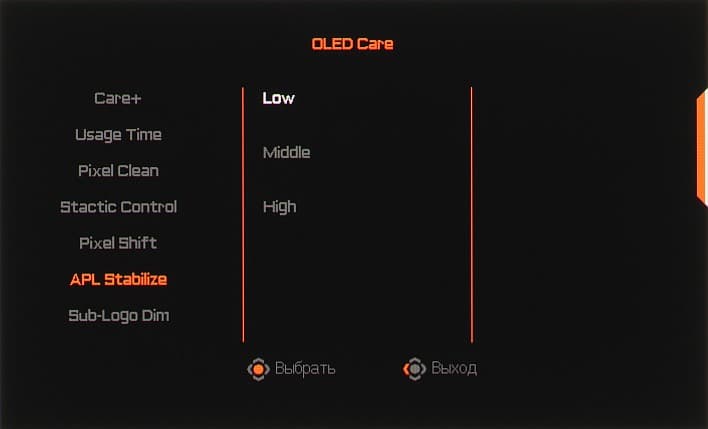 Если на экране оно, то нажатие на джойстик — выход из меню, отклонение вниз — выключение монитора (его можно выключить и без меню длительным нажатием на джойстик), вверх — вход в основное меню установок, вправо — меню с настройками игровых функций, влево — функции OLED Care.