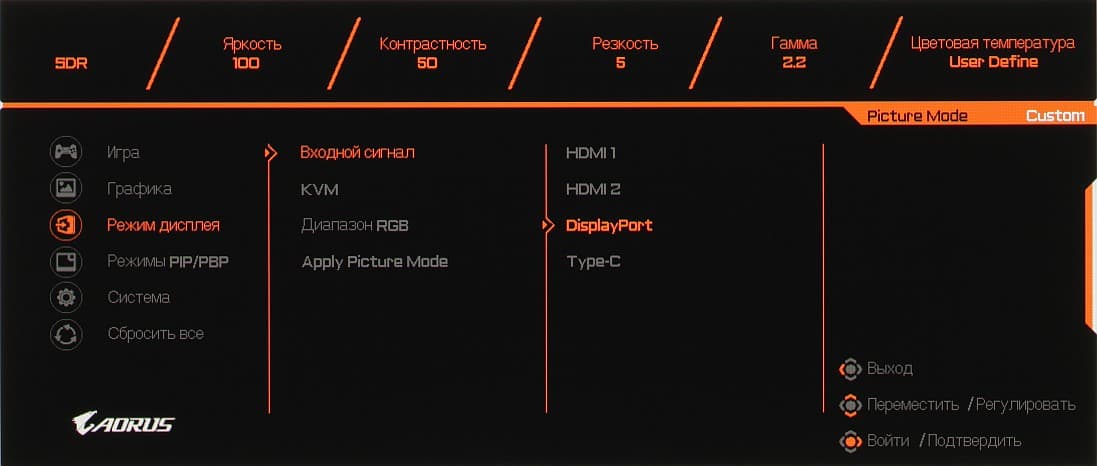 Есть встроенный концентратор USB (USB 3.2 Gen 1) на два порта. В наличие также не часто встречающаяся в мониторах функция KVM — к монитору по USB можно подключить клавиатуру и мышь (а можно и накопитель), чтобы затем их использовать с двумя источниками видеосигнала, например, с ПК и ноутбуком, или с ПК и планшетом. При этом один из источников должен быть подключен по USB-C (ввод видеосигнала по этому же интерфейсу, или по DisplayPort, или по HDMI), а второй — по USB через разъем USB-B (ввод видеосигнала или по DisplayPort, или по HDMI). Источники переключаются отклонением джойстика (если так настроено), выбором пункта в меню настроек монитора и в приложении Gigabyte Control Center.