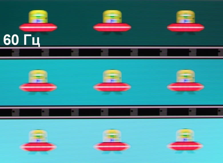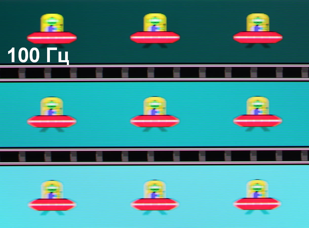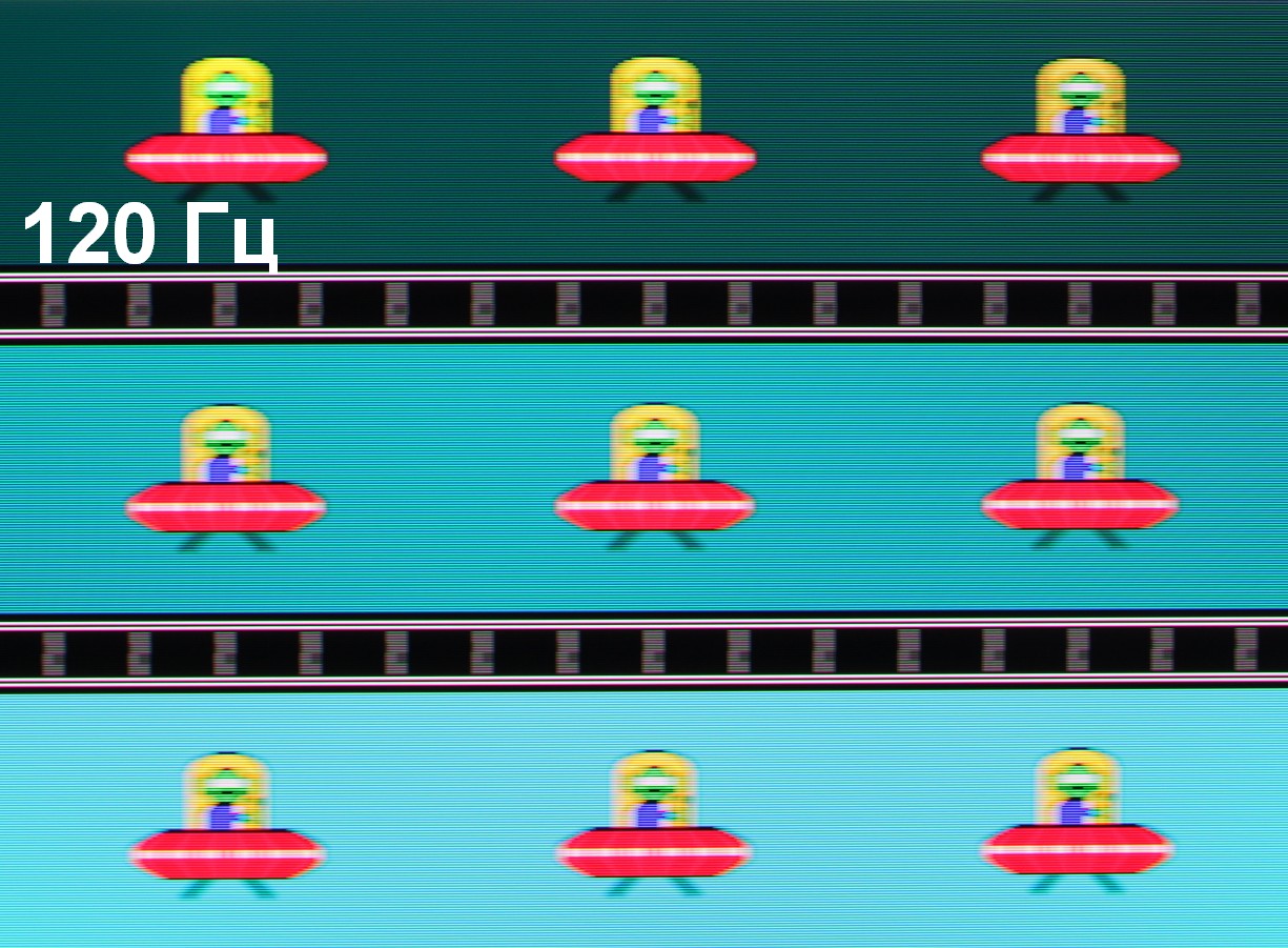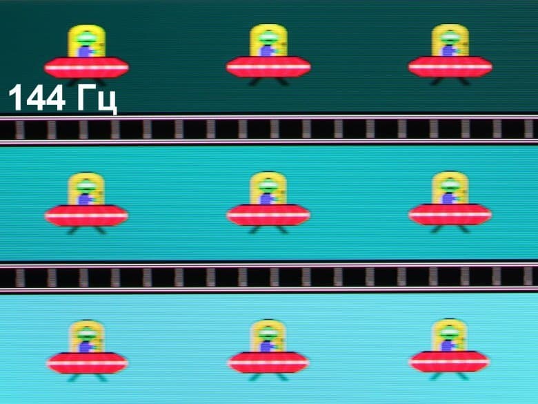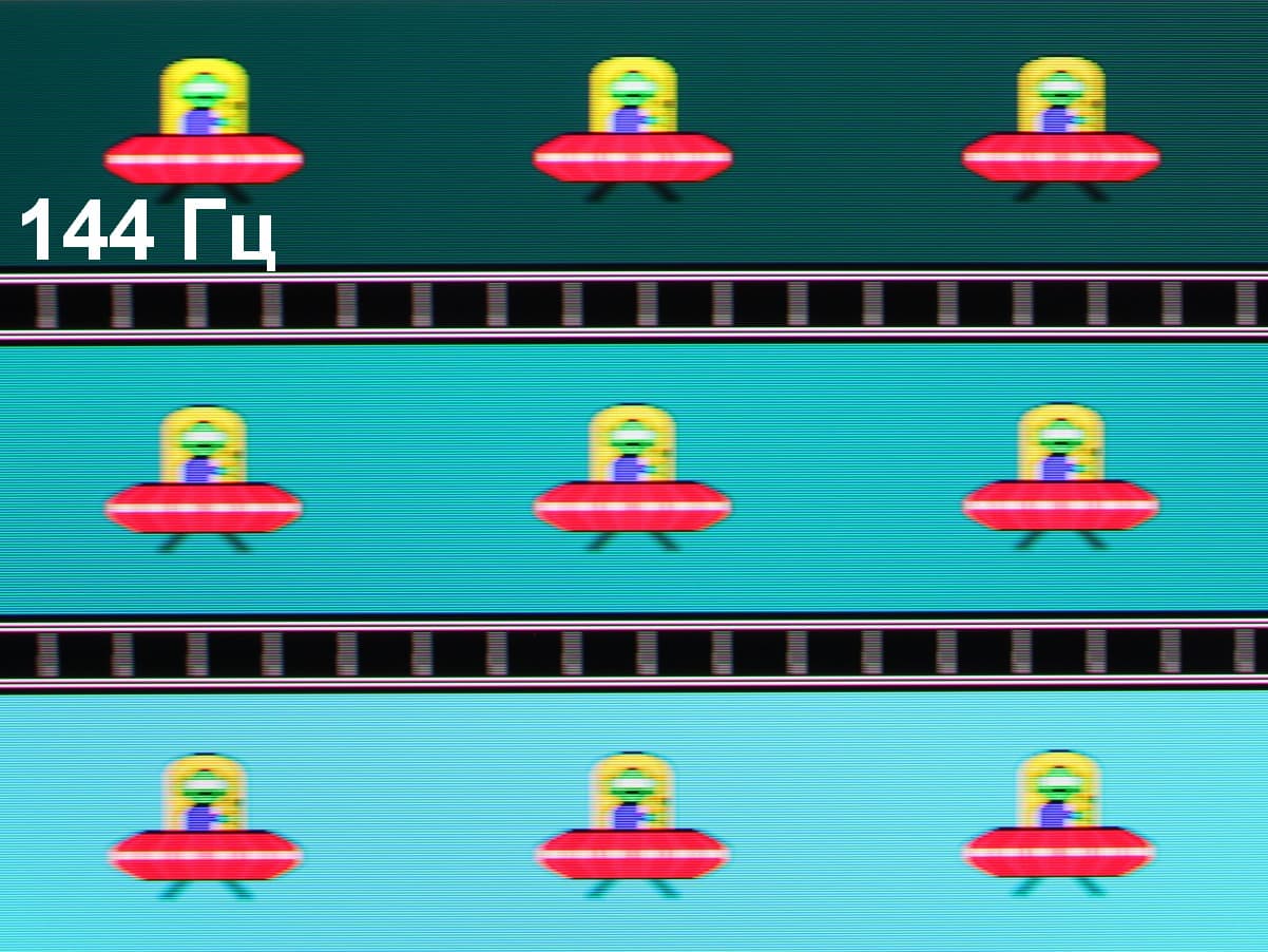 Для наглядного представления о том, что на практике означает такая скорость матрицы приведем серию снимков, полученных с помощью движущейся камеры. Такие снимки показывают, что видит человек, если он следит глазами за двигающимся на экране объектом. Описание теста приведено тут, страница с самим тестом тут. Использовались рекомендованные установки (скорость движения 960 пиксель/с для частот 60 и 120 Гц, 1000 пиксель/с для 100 Гц, 1008 пиксель/с для 144 Гц), выдержка 1/15 с. На фотографиях указаны значения частоты обновления:
