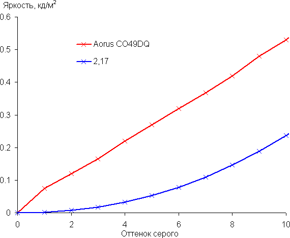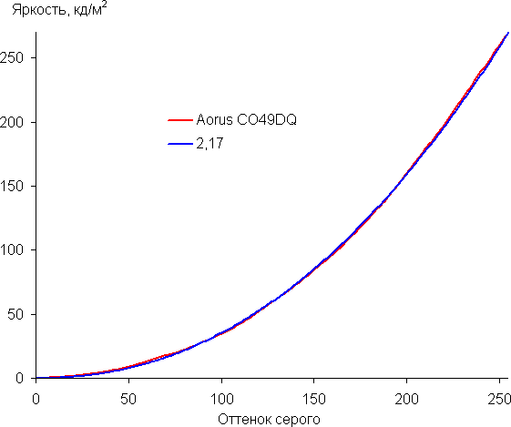 Рост прироста яркости более-менее равномерный, и каждый следующий оттенок значимо ярче предыдущего, даже в самой темной области, что для игрового монитора очень полезно::