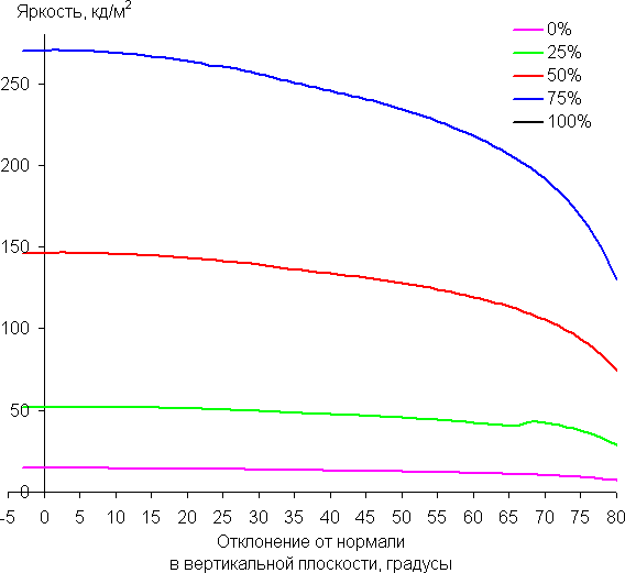 Снижение яркости на 50% от максимального значения достигается только при порядка 80 градусах отклонения. Для сравнения: в случае типичного ЖК-монитора на матрице VA яркость падает вдвое уже примерно при 35°.