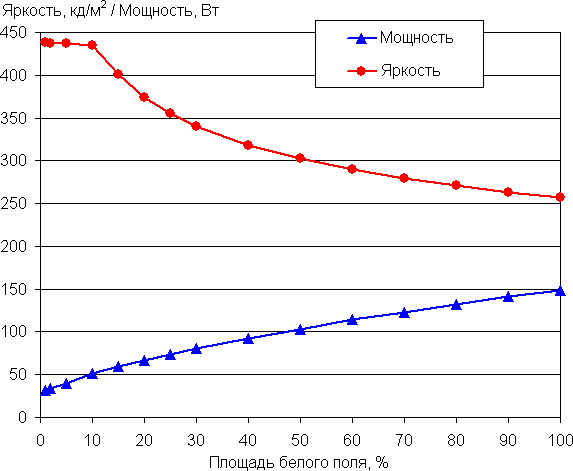 С изменением площади белого максимальная яркость также может меняться, при этом характер зависимости яркости от площади белого участка зависит как минимум от текущего режима — SDR или HDR — и от выбранного профиля. Например, в случае сигнала SDR при выбранном профиле sRGB яркость от 1% до 100% площади белого сохраняется на уровне порядка 250 кд/м² (дополнительно по вертикальной оси отложена потребляемая мощность):