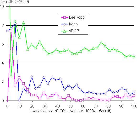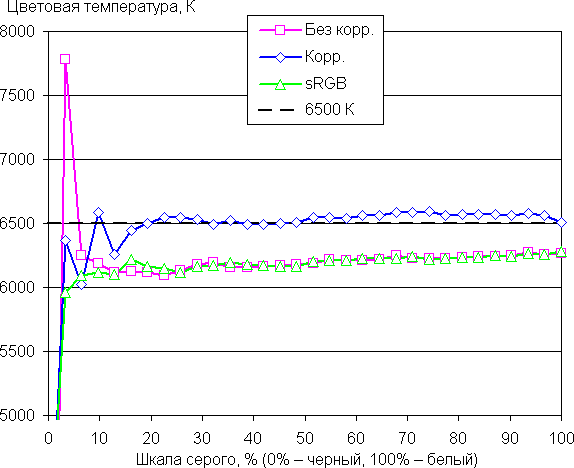 Графики ниже показывают цветовую температуру на различных участках шкалы серого и отклонение от спектра абсолютно черного тела (параметр ΔE) в случае настроек по умолчанию (подписано — Без корр.), после коррекции цветового баланса (97/98/100 для усиления R/G/B). и при выборе профиля sRGB (sRGB) без дополнительной коррекции (которая, впрочем, и так невозможна):
