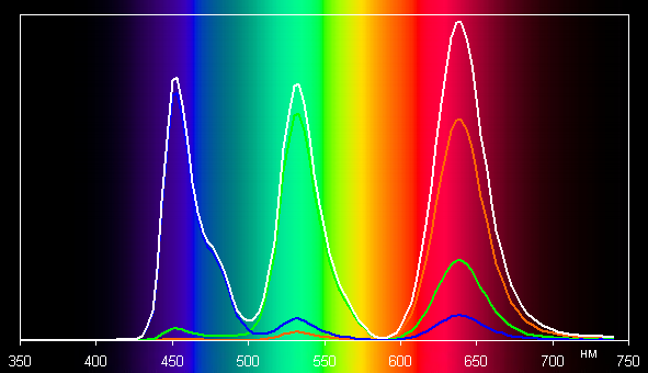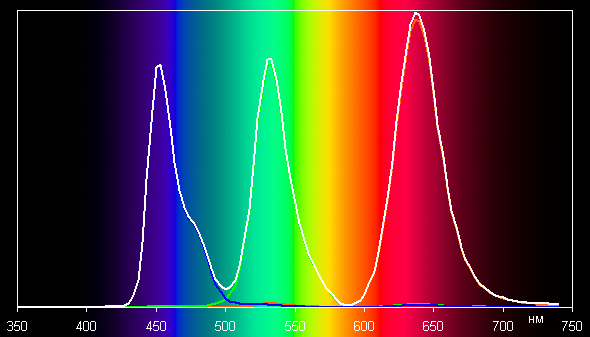 Ниже приведен спектр для белого поля (белая линия), наложенный на спектры красного, зеленого и синего полей (линии соответствующих цветов) в случае исходного цветового охвата: