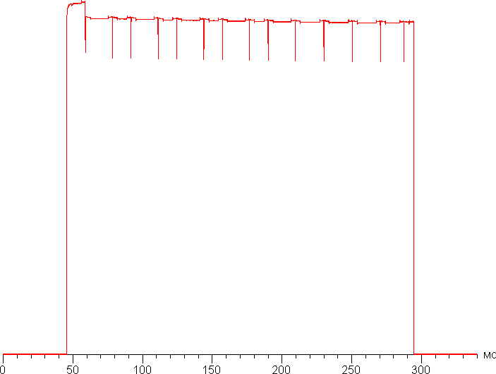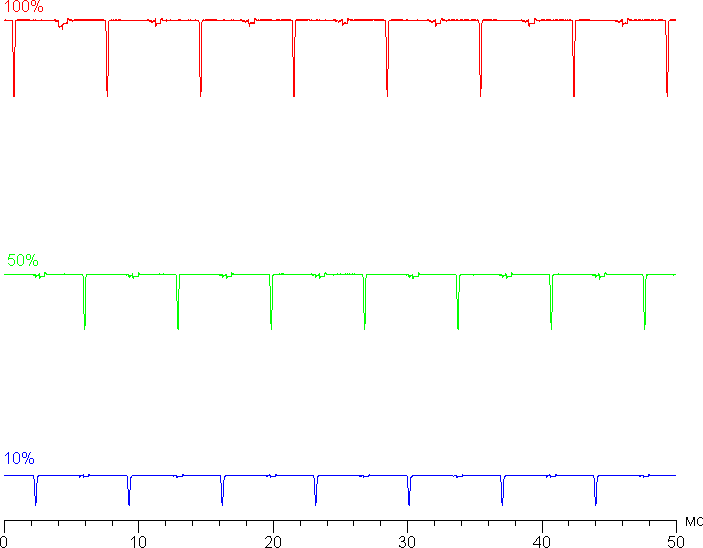 На любом уровне яркости видимое мерцание отсутствует, его не выявляет и тест на стробоскопический эффект. Регистрация зависимости яркости от времени при различных уровнях яркости выявила модуляцию яркости с очень высоким коэффициентом заполнения, что и объясняет отсутствие мерцания. В доказательство приведем графики зависимости яркости (вертикальная ось) от времени (горизонтальная ось) при различных значениях настройки Яркость в случае белого поля на 10% от площади экрана.