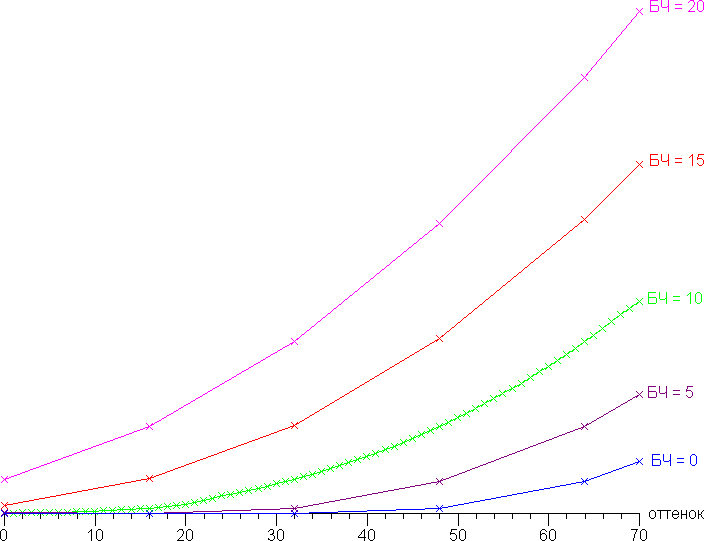 Дополнительной настройкой Баланс черного (сократим до БЧ, значения от 0 до 20, по умолчанию 10) можно скорректировать гамма-кривую, улучшая или ухудшая различимость деталей в тенях. Первое может быть полезно в играх с темными сценами. Ниже приведены гамма-кривые при нескольких значениях БЧ (построенные по 32 точкам):