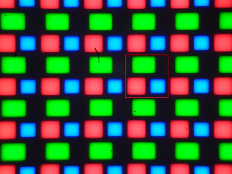 В данном экране используется матрица типа QD-OLED — активная матрица на органических светодиодах. Полноцветное изображение создается с помощью субпикселей трех цветов — красного (R), зеленого (G) и синего (B) в равном количестве — по три разного вида на пиксель. Каждый субпиксель имеет свой независимо управляемый OLED-источник синего света, а красный и зеленый цвета формируются с помощью светофильтров на квантовых точках (QD — Quantum Dots), размещенных перед этими источниками. Синий субпиксель светофильтра, разумеется, не имеет. Упрощенная схема ниже поясняет устройство QD-OLED: