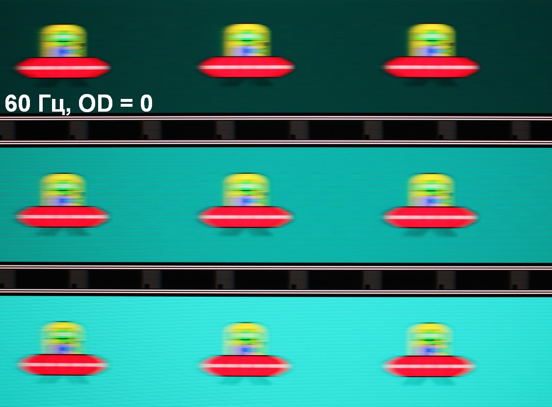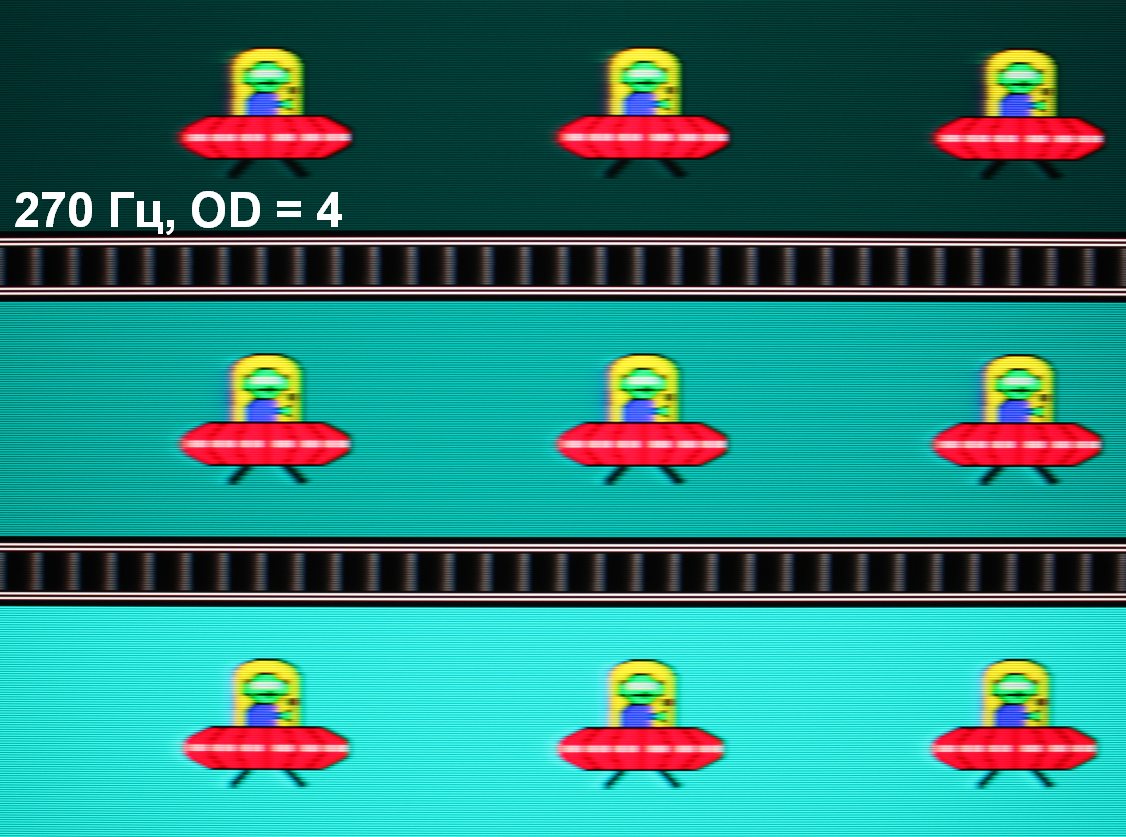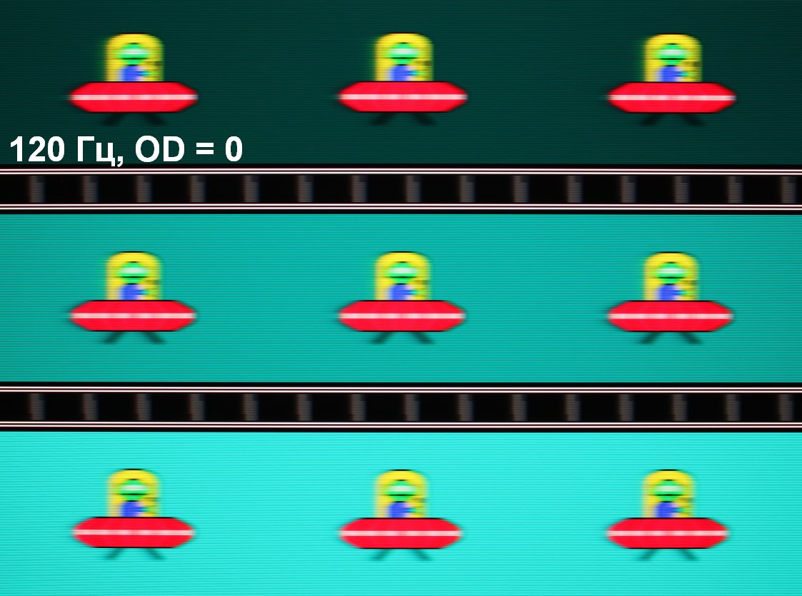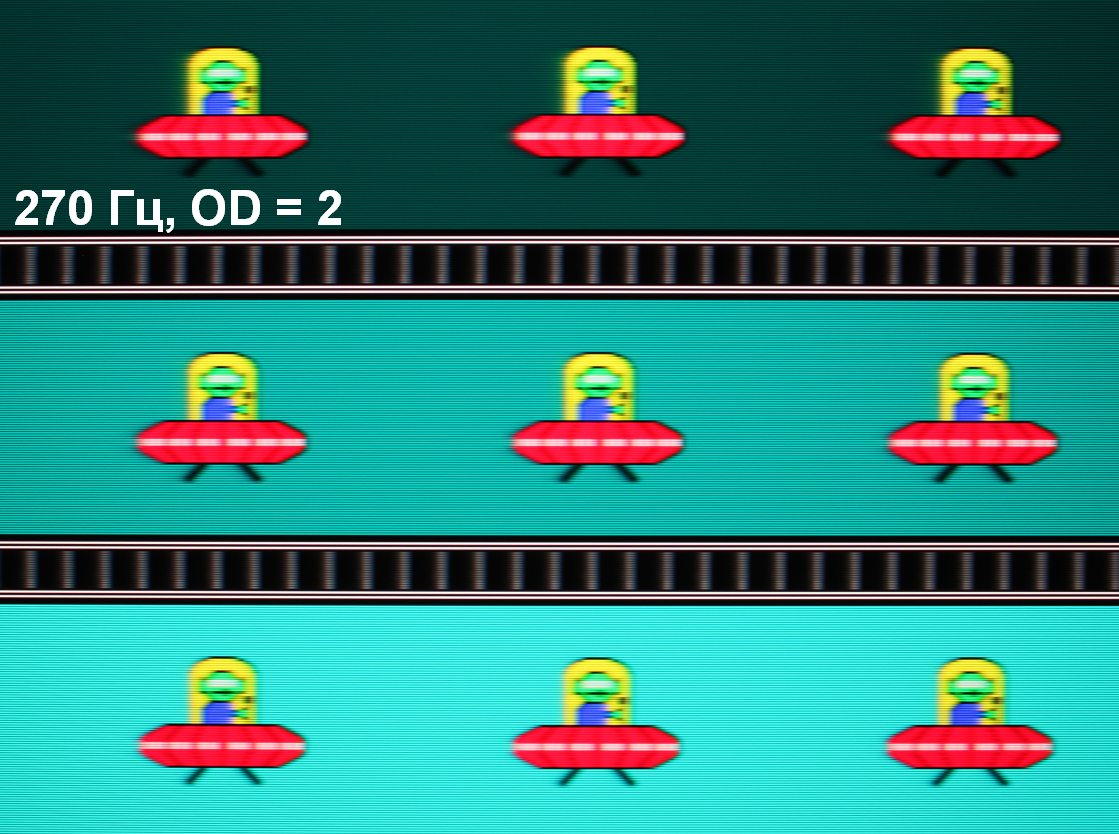 Видно, что при прочих равных условиях четкость изображения повышается по мере роста частоты обновления и степени разгона, но на максимальном разгоне артефакты уже заметные. Включение Aim Stabilizer увеличивает четкость, но объекты в движении троятся, что снижает положительный эффект. Оптимальным с нашей точки зрения является выбор предпоследней ступени разгона без включения Aim Stabilizer.