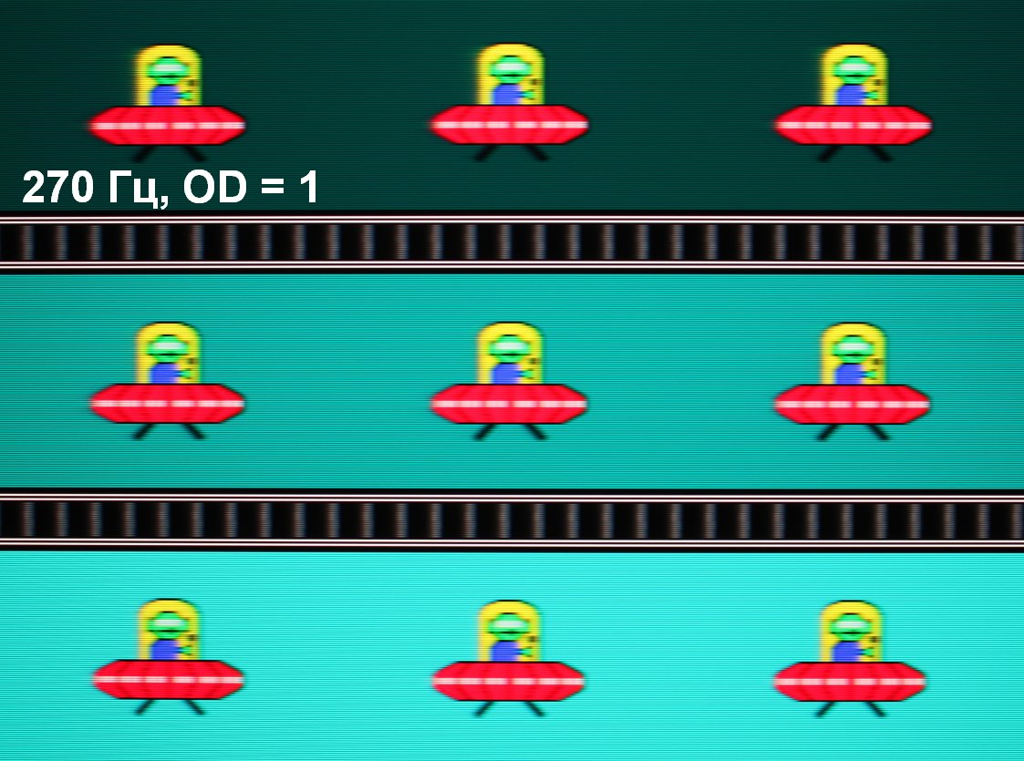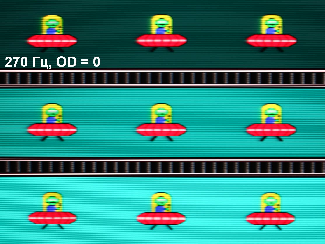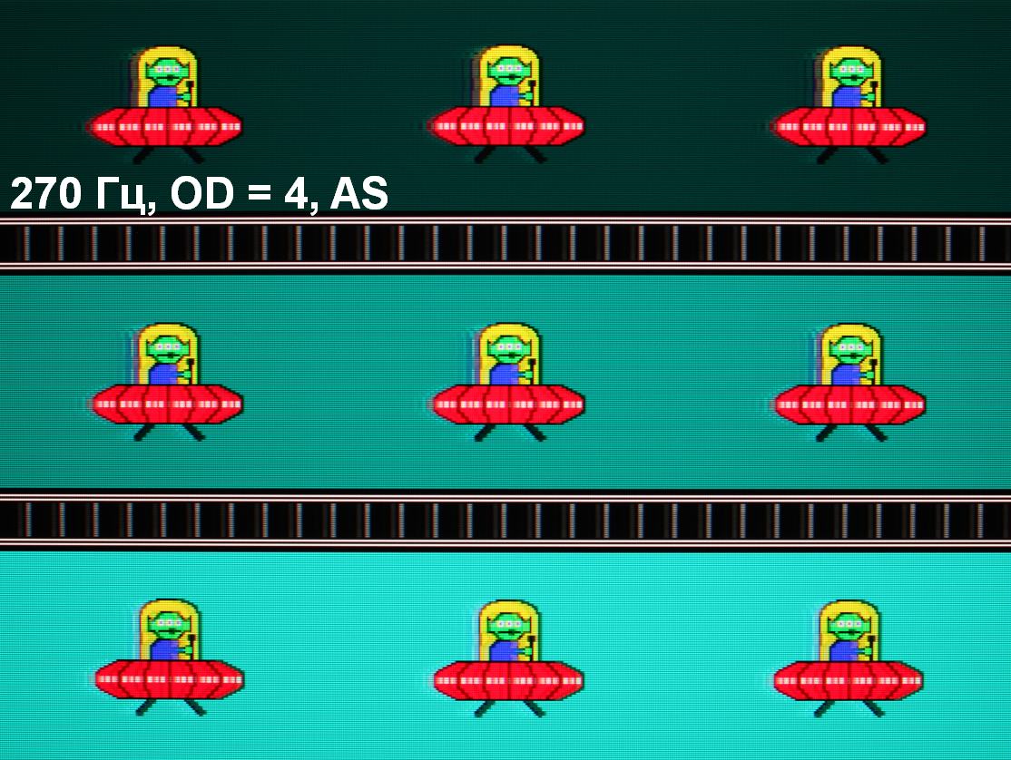 Для наглядного представления о том, что на практике означает такая скорость матрицы, какие могут быть артефакты от разгона и повышает ли четкость в движении, описанная выше настройка Aim Stabilizer Sync, приведем серию снимков, полученных с помощью движущейся камеры. Такие снимки показывают, что видит человек, если он следит глазами за двигающимся на экране объектом. Описание теста приведено тут, страница с самим тестом тут. Использовались рекомендованные установки (скорость движения 960, 1008, 990, 1000 и 1080 пиксель/с для частот обновления 60 (и 120), 144, 165, 200 и 270 Гц), выдержка 1/15 с, на фотографиях указаны значения частоты обновления, а также ступень разгона (OD) и включен ли режим Aim Stabilizer Sync (AS).