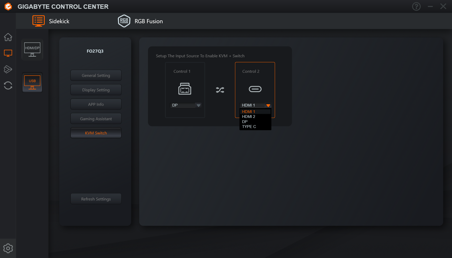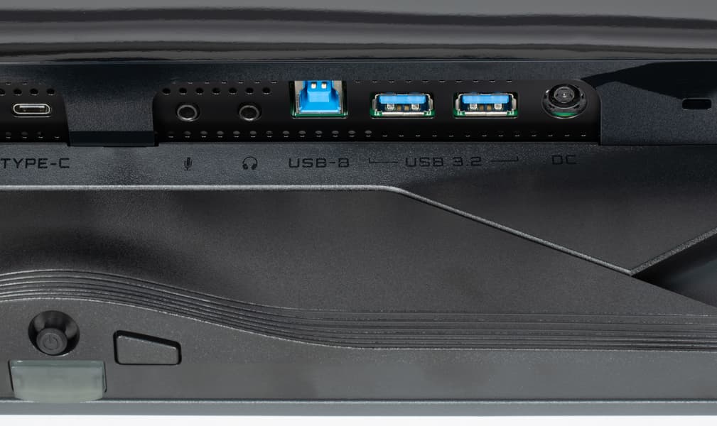 Есть встроенный концентратор USB (USB 3.2 Gen 1) на два порта. В наличие также не часто встречающаяся в мониторах функция KVM — к монитору по USB можно подключить клавиатуру и мышь (а можно и накопитель), чтобы затем их использовать с двумя источниками видеосигнала, например, с ПК и ноутбуком, или с ПК и планшетом. При этом один из источников должен быть подключен по USB-C (ввод видеосигнала по этому же интерфейсу, или по DisplayPort, или по HDMI), а второй — по USB через разъем USB-B (ввод видеосигнала или по DisplayPort, или по HDMI). Источники и порты USB переключаются просто выбором соответствующего входа, кнопкой на мониторе, выбором пункта в меню настроек монитора и в приложении Gigabyte Control Center.