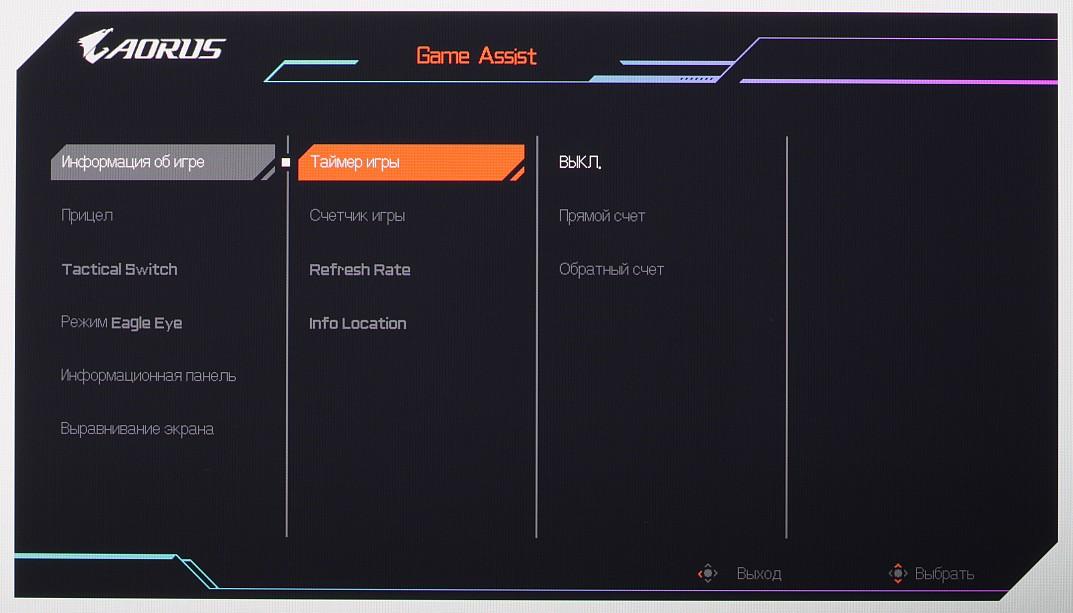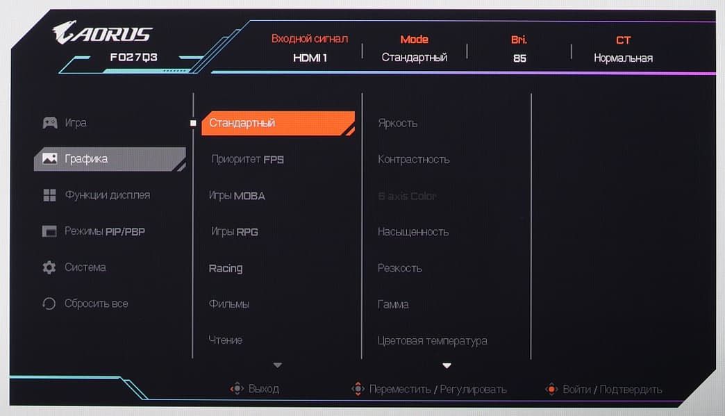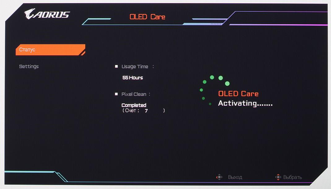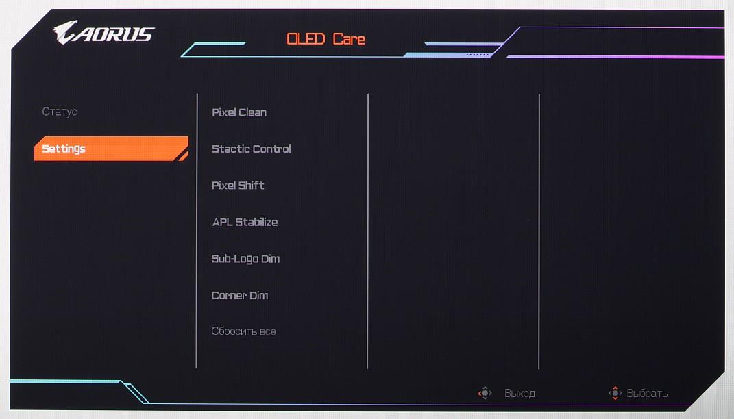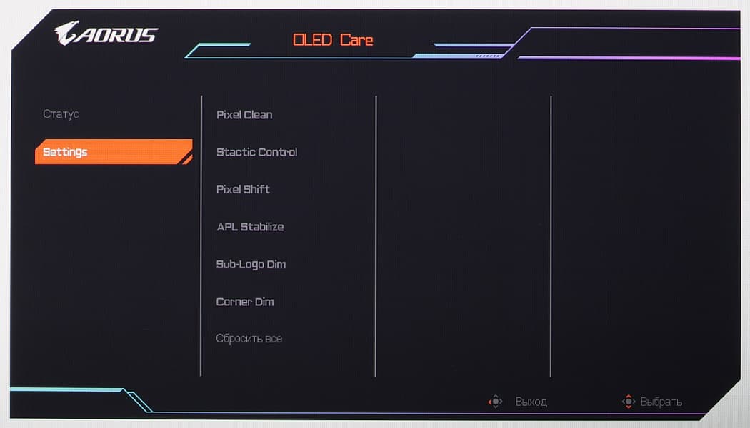 Если на экране оно, то нажатие на джойстик — выход из меню, отклонение вниз — выключение монитора (его можно выключить и без меню длительным нажатием на джойстик), вверх — вход в основное меню установок, вправо — меню с настройками игровых функций, влево — функции OLED Care.
