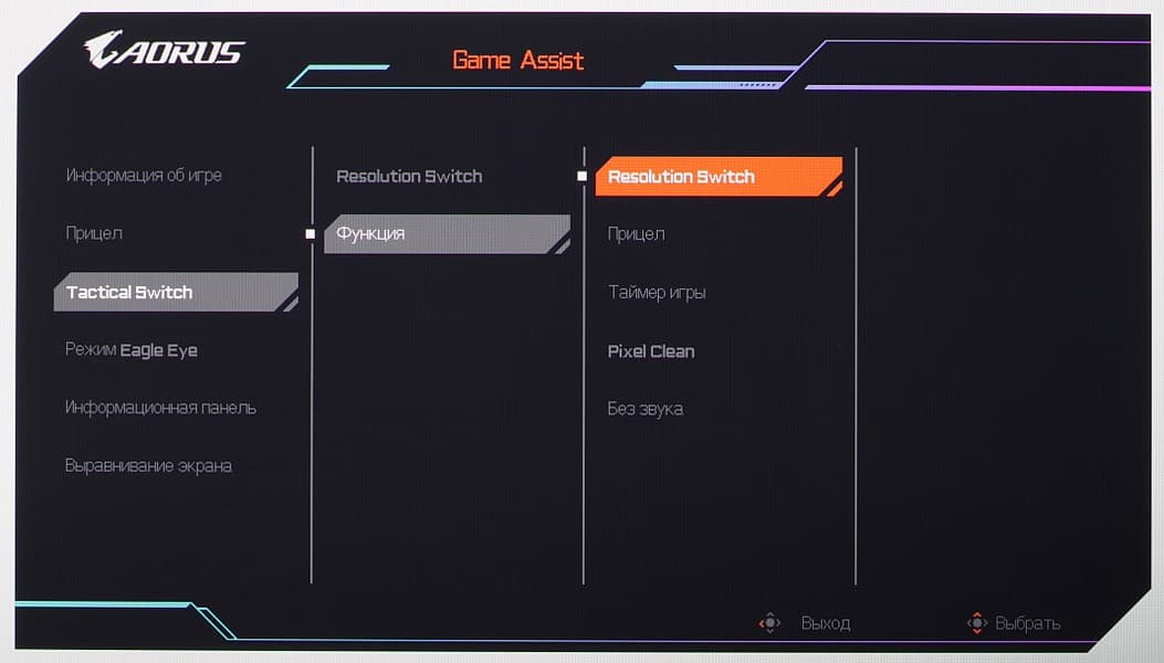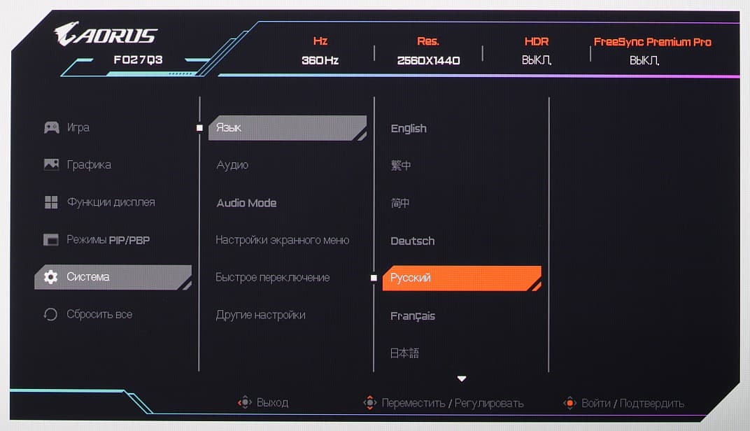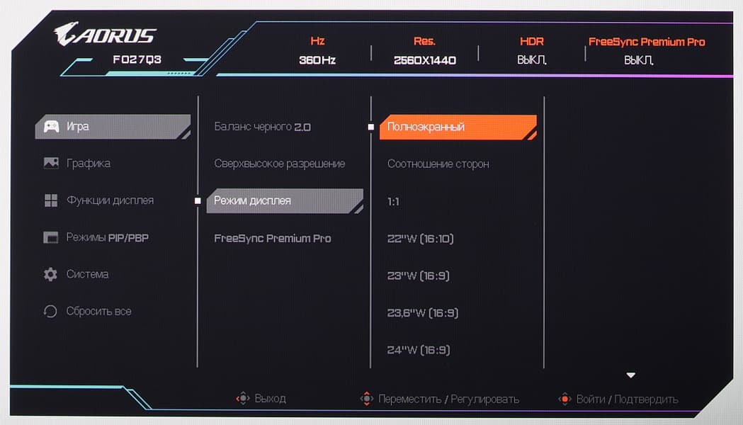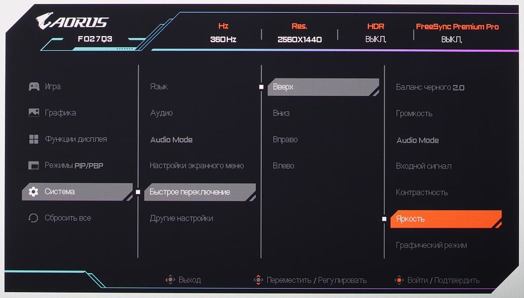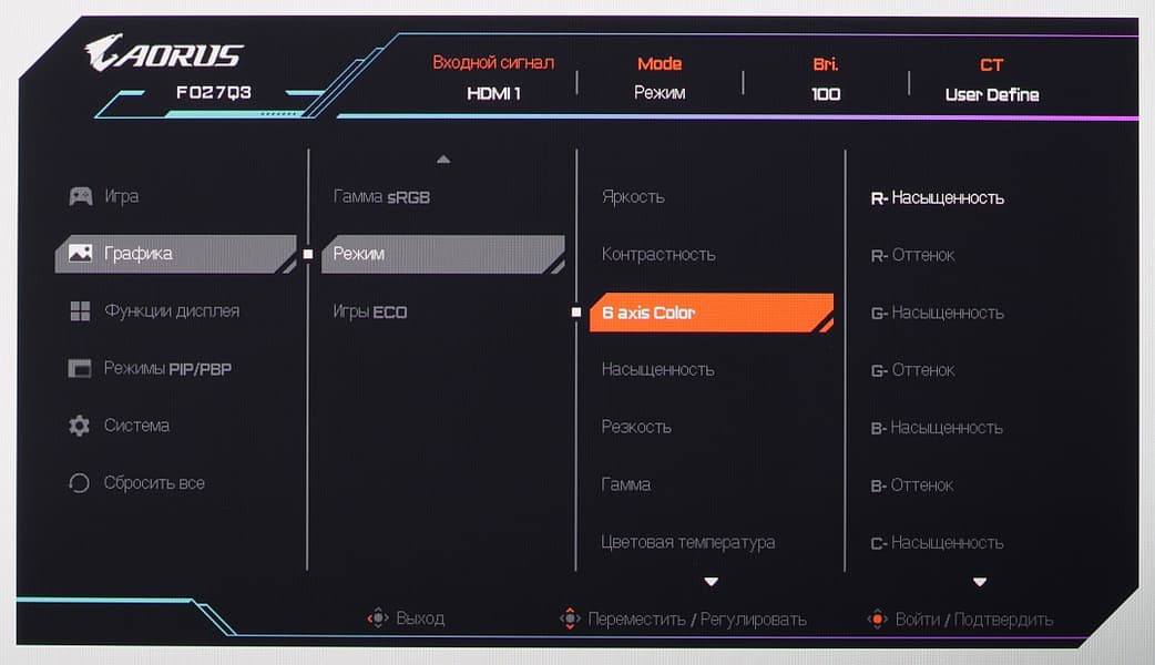 Если на экране оно, то нажатие на джойстик — выход из меню, отклонение вниз — выключение монитора (его можно выключить и без меню длительным нажатием на джойстик), вверх — вход в основное меню установок, вправо — меню с настройками игровых функций, влево — функции OLED Care.