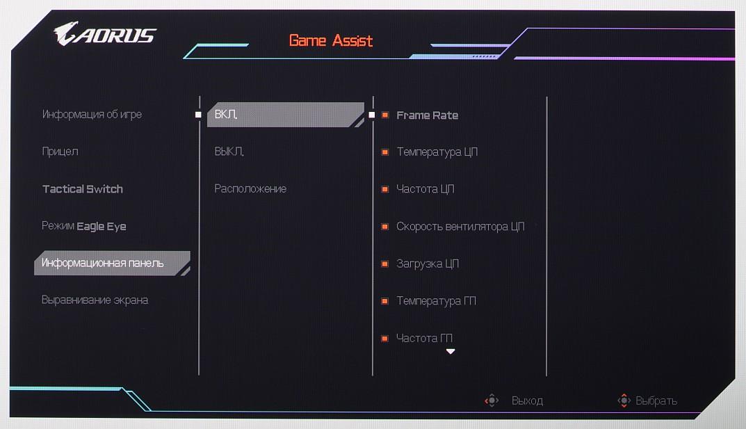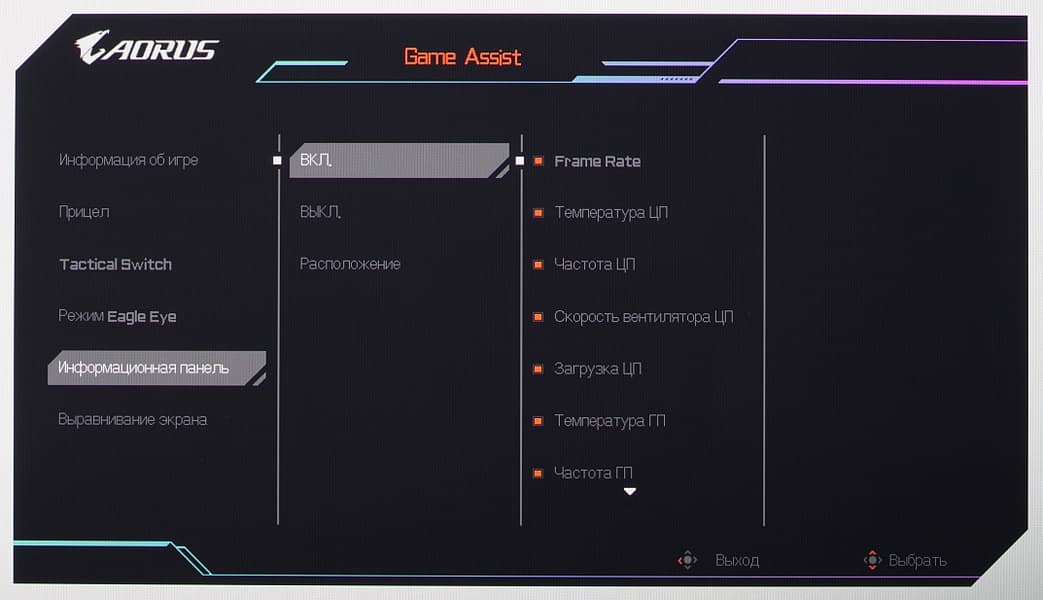 Из дополнительных возможностей в наборе Game Assist (Игровой ассистент) присутствуют несколько «геймерских» функции: таймер, пользовательский счетчик, вывод частоты кадров, перекрестия прицела в центре экрана и меток для выравнивания установленных встык мониторов.