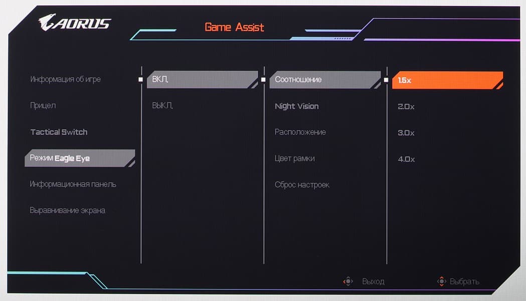 Также можно выбрать функцию, назначенную на нажатие тактической кнопки, и включить функцию увеличения центральной области экрана (Eagle Eye — орлиного глаза) — вывод прямоугольной области с увеличением в 1,5, 2, 3 или 4 раза для лучшего прицеливания, при этом пользователь может выбирать ее расположение на экране, вывод с красной или белой рамкой или без рамки, а также режим имитации ночного прицела (зеленые тона).