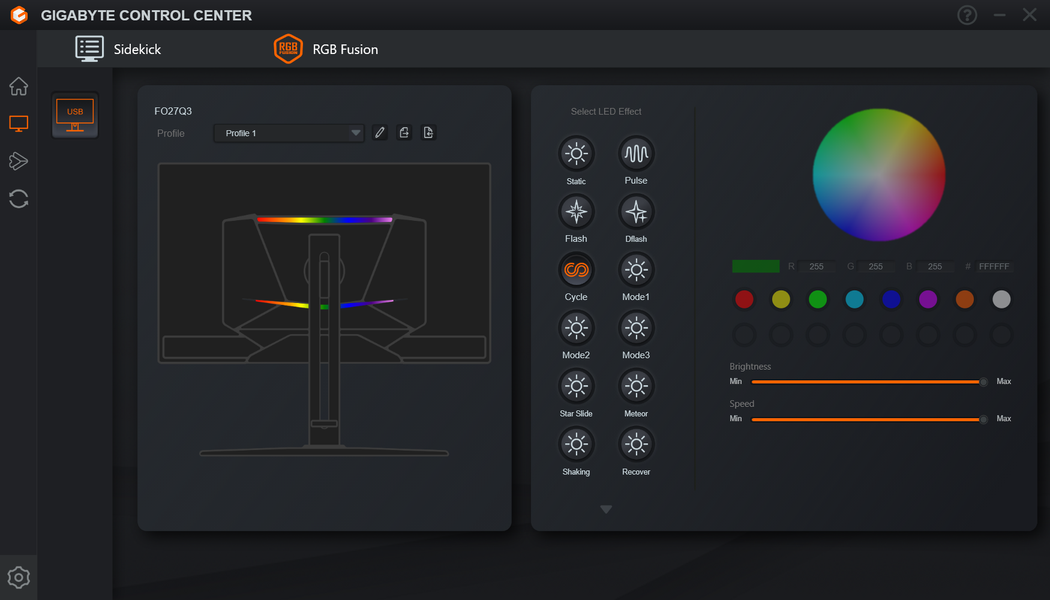 Дополнительно подсвечивается полоска в нижней части кожуха. В меню монитора декоративную подсветку можно отключить или выбрать для нее один из трех динамичных эффектов. Больше режимов работы подсветки доступно в приложении Gigabyte Control Center.