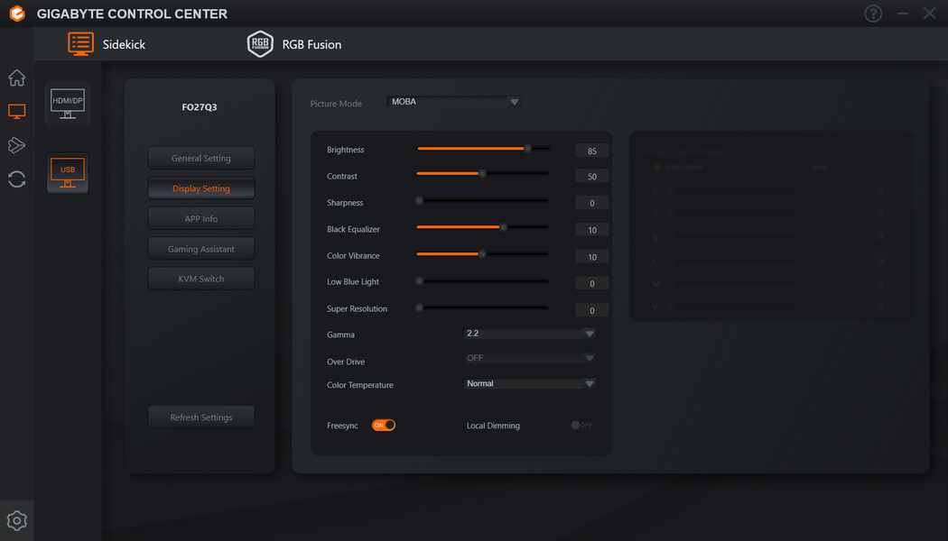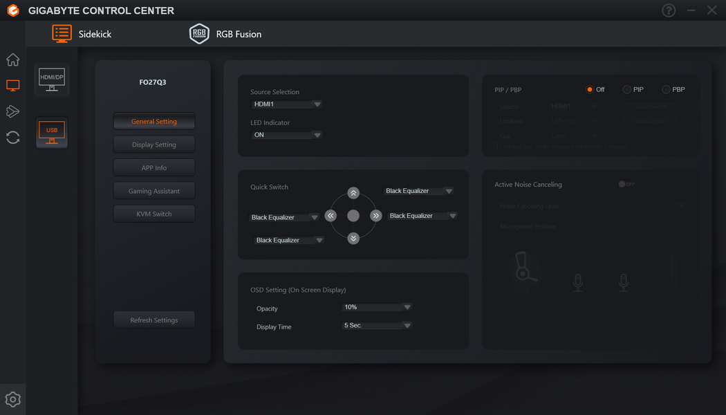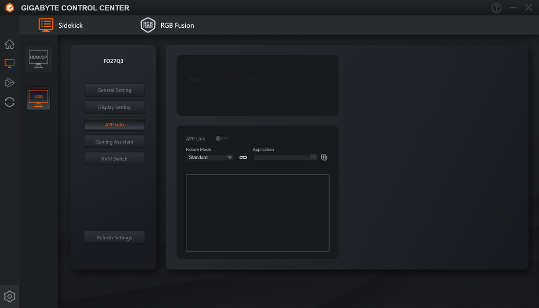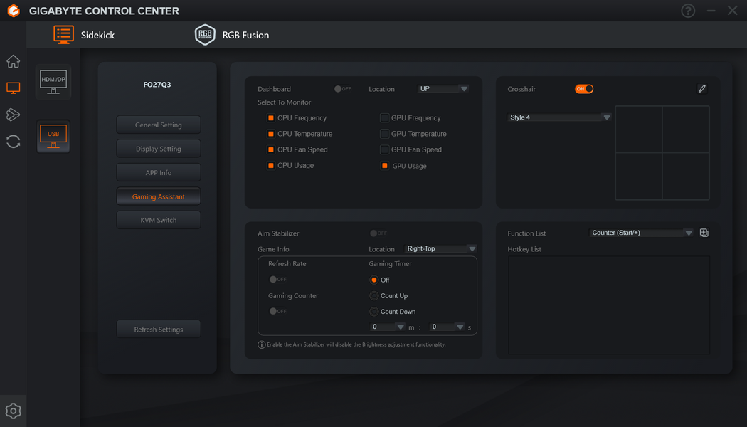 Монитором можно управлять с ПК с помощью фирменного ПО Gigabyte Control Center на вкладке Sidekick. Кроме настроек, доступных из меню монитора, в этом ПО можно задавать клавиатурные сокращения для ряда настроек и привязывать профиль с настройками монитора к активному приложению. Только при запущенной Gigabyte Control Center на монитор выводятся данные на панель Dashboard. И именно в Sidekick задаются клавиатурные сокращения, которым пользователь может увеличивать и уменьшать значение пользовательского счетчика. Что им полезно будет считать — зависит от игры.