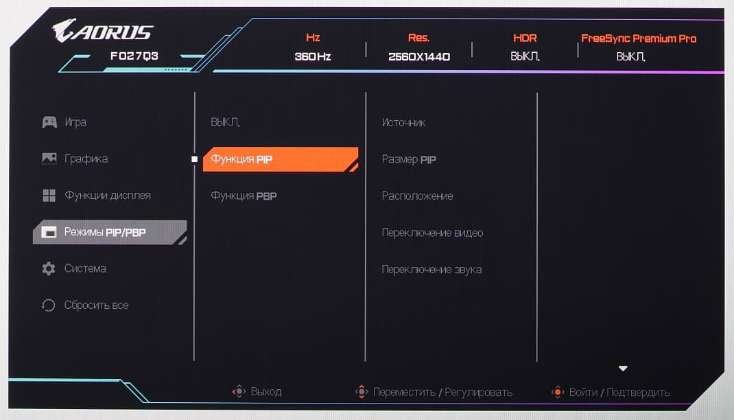 В режиме PIP выбирается положение дополнительного окна в одном из четырех углов, а также его размер из трех возможных (самый большой – это точно 1/4 экрана). В режиме PBP можно получить два изображения 1280×1440 с выводом точка в точку от независимых источников с заполнением всей области отображения.
