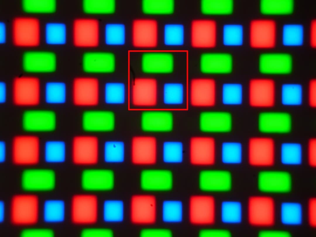 В данном экране используется матрица типа QD-OLED — активная матрица на органических светодиодах. Полноцветное изображение создается с помощью субпикселей трех цветов — красного (R), зеленого (G) и синего (B) в равном количестве — по три разного вида на пиксель. Каждый субпиксель имеет свой независимо управляемый OLED-источник синего света, а красный и зеленый цвета формируются с помощью светофильтров на квантовых точках (QD — Quantum Dots), размещенных перед этими источниками. Синий субпиксель светофильтра, разумеется, не имеет. Упрощенная схема ниже поясняет устройство QD-OLED: