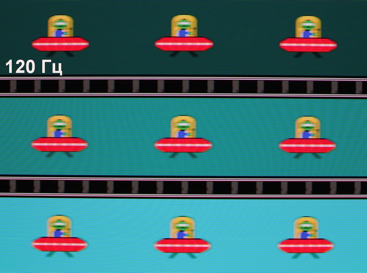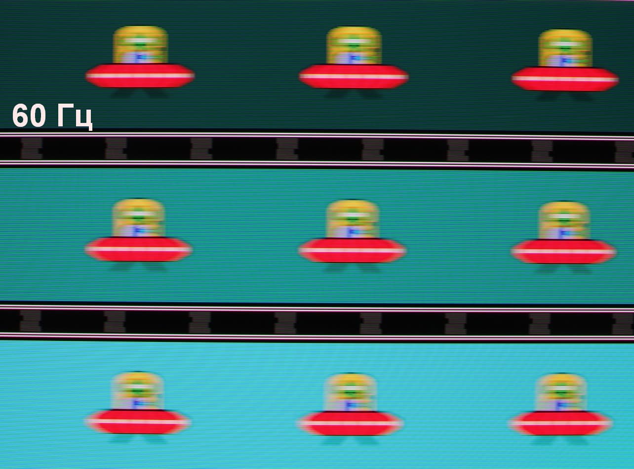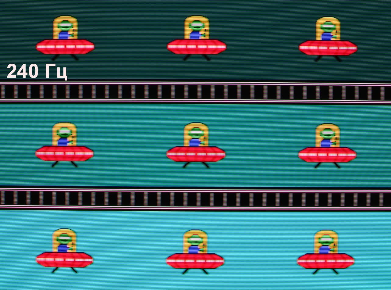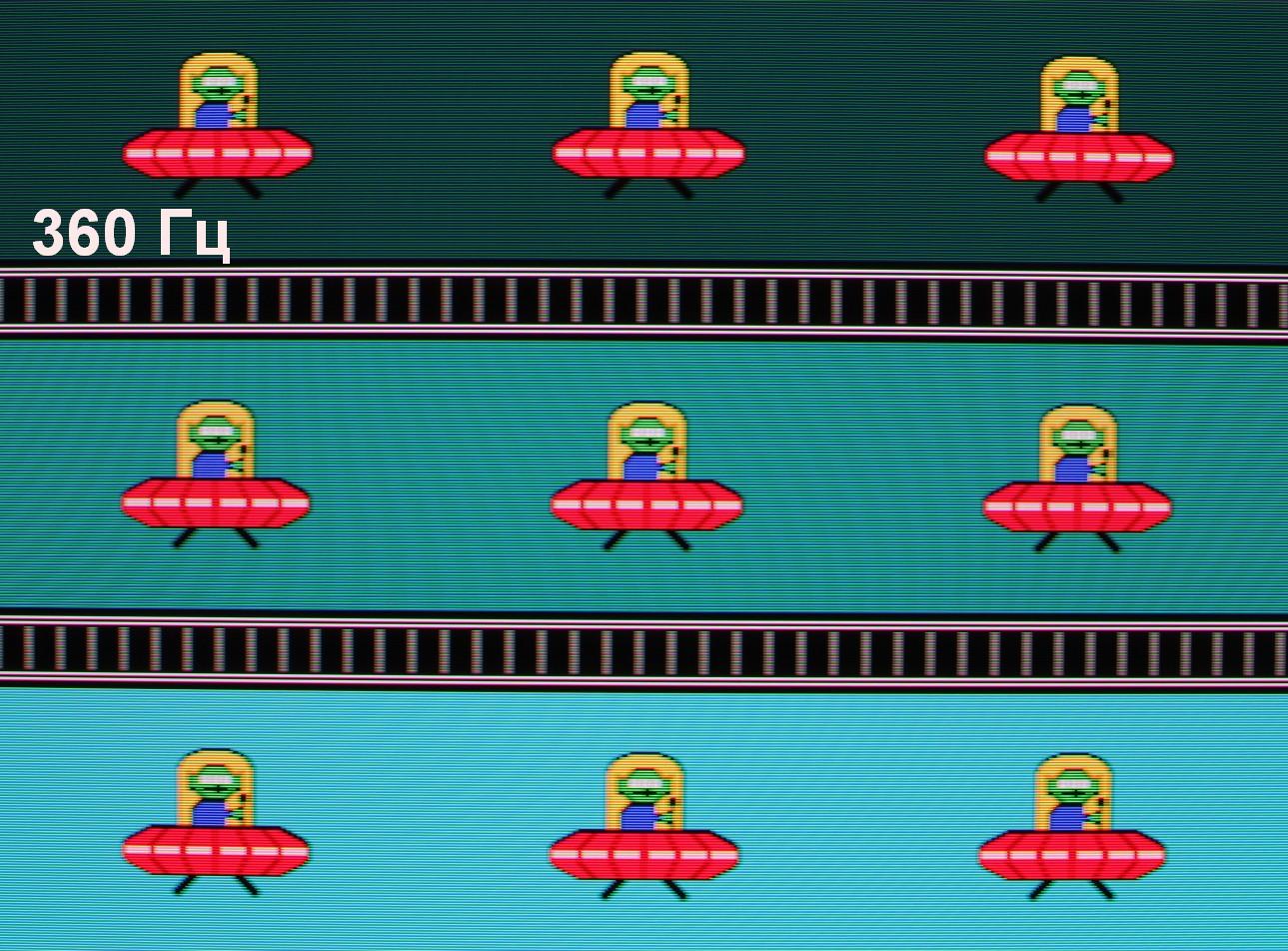 Для наглядного представления о том, что на практике означает такая скорость матрицы приведем серию снимков, полученных с помощью движущейся камеры. Такие снимки показывают, что видит человек, если он следит глазами за двигающимся на экране объектом. Описание теста приведено тут, страница с самим тестом тут. Использовались рекомендованные установки (скорость движения 960 пиксель/с для частот 60, 120 и 240 Гц и 1080 пиксель/с для 360 Гц), выдержка 1/15 с. На фотографиях указаны значения частоты обновления: