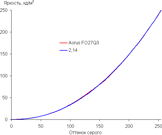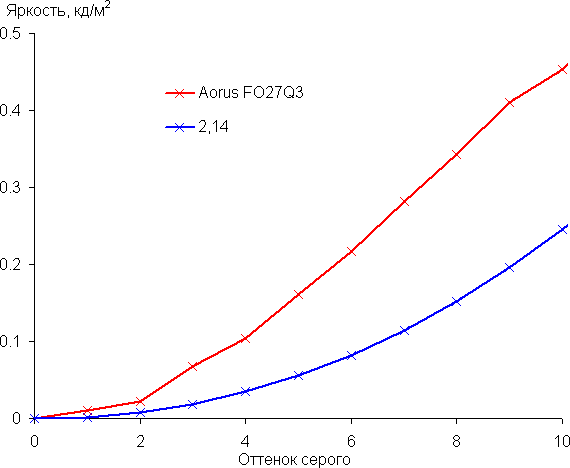 Рост скорости изменения яркости более-менее равномерный, и каждый следующий оттенок значимо ярче предыдущего, даже в самой темной области, что для игрового монитора очень хорошо: