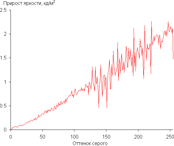 Для оценки характера роста яркости на шкале серого мы измерили яркость 256 оттенков серого (от 0, 0, 0 до 255, 255, 255) при значении настройки Гамма 2.2. График ниже показывает скорость изменения (не абсолютное значение!) яркости между соседними полутонами: