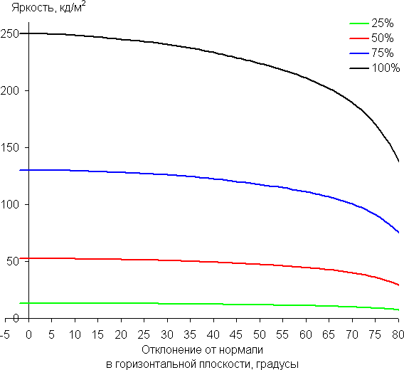Снижение яркости на 50% от максимального значения достигается только при более чем 80 градусах отклонения. Для сравнения: в случае типичного ЖК-монитора на матрице VA яркость падает вдвое уже примерно при 35°.