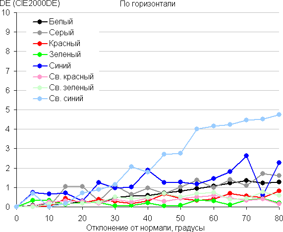 Для количественной характеристики изменения цветопередачи мы провели колориметрические измерения для белого, серого (127, 127, 127), красного, зеленого и синего, а также светло-красного, светло-зеленого и светло-синего полей во весь экран с использованием установки, подобной той, что применялась в предыдущем тесте. Измерения проводились в диапазоне углов от 0° (датчик направлен перпендикулярно к экрану) до 80° с шагом в 5°. Полученные значения интенсивностей были пересчитаны в отклонение ΔE относительно замера каждого поля при перпендикулярном положении датчика относительно экрана. Результаты представлены ниже: