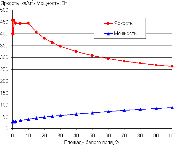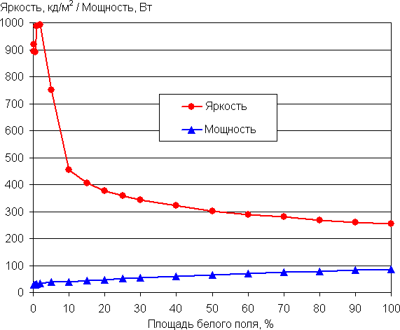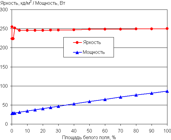 С изменением площади белого максимальная яркость также может меняться, при этом характер зависимости яркости от площади белого участка зависит как минимум от текущего режима — SDR или HDR. В случае HDR пользователь дополнительно может выбирать в настройках монитора между профилями HDR и HDR Peak 1000. Например, в случае сигнала SDR яркость от 0,1% до 100% площади белого сохраняется на уровне порядка 250 кд/м² (дополнительно по вертикальной оси отложена потребляемая мощность):