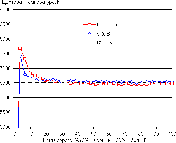 Графики ниже показывают цветовую температуру на различных участках шкалы серого и отклонение от спектра абсолютно черного тела (параметр ΔE) в случае настроек по умолчанию (подписано — Без корр.) и при выборе профиля sRGB (sRGB) также без дополнительной коррекции (которая, впрочем, и так невозможна):