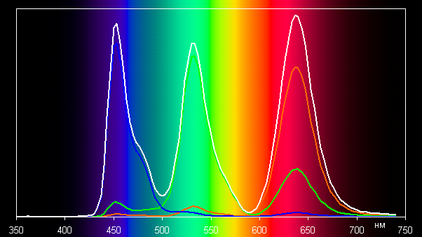 Ниже приведен спектр для белого поля (белая линия), наложенный на спектры красного, зеленого и синего полей (линии соответствующих цветов) в случае исходного цветового охвата: