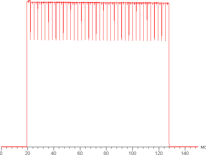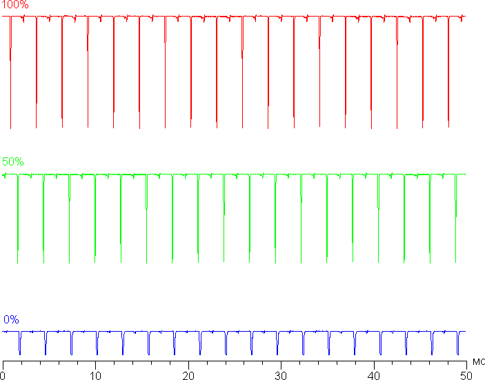 На любом уровне яркости видимое мерцание отсутствует, его не выявляет и тест на стробоскопический эффект. Регистрация зависимости яркости от времени при различных уровнях яркости выявила модуляцию яркости с очень высоким коэффициентом заполнения, что и объясняет отсутствие мерцания. В доказательство приведем графики зависимости яркости (вертикальная ось) от времени (горизонтальная ось) при различных значениях настройки Яркость в случае белого поля на 10% от площади экрана.