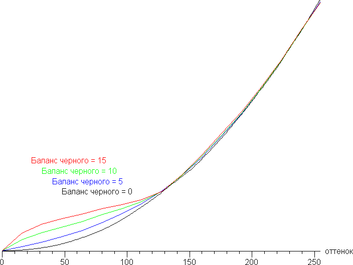 Дополнительной настройкой Баланс черного (значения от 0 до 15 с шагом 1, по умолчанию 0) можно скорректировать гамма-кривую, улучшая различимость деталей в тенях. Это может быть полезно в играх с темными сценами. Ниже приведены гамма-кривые при нескольких значениях БЧ (построенные по 32 точкам):