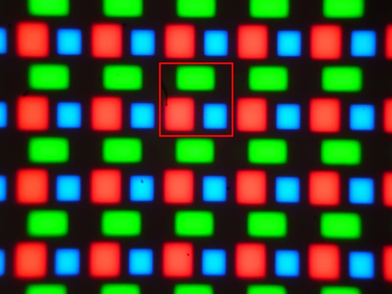 Так выглядят пиксели матрицы этого монитора при не очень большом увеличении в случае вывода белого цвета: