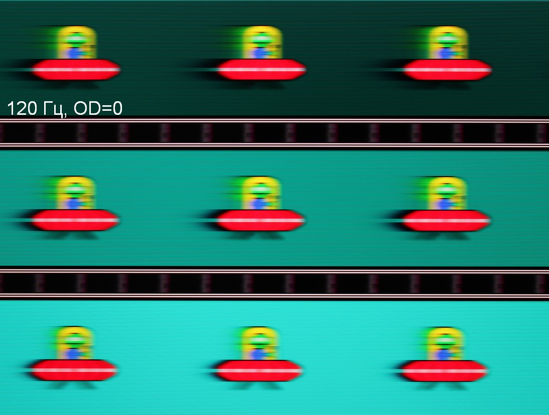 Для наглядного представления о том, что на практике означает такая скорость матрицы, какие могут быть артефакты от разгона и повышает ли четкость в движении, описанная выше настройка Aim Stabilizer, приведем серию снимков, полученных с помощью движущейся камеры. Такие снимки показывают, что видит человек, если он следит глазами за двигающимся на экране объектом. Описание теста приведено тут, страница с самим тестом тут. Использовались рекомендованные установки (скорость движения 1080, 1071 и 1008 пиксель/с для частот обновления 60, 120 (119) и 144 Гц), выдержка 1/15 с, на фотографиях указаны значения частоты обновления, а также ступень разгона (OD) и включен ли режим Aim Stabilizer (AS).