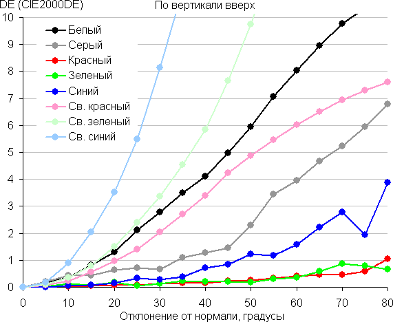 Для количественной характеристики изменения цветопередачи мы провели колориметрические измерения для белого, серого (127, 127, 127), красного, зеленого и синего, а также светло-красного, светло-зеленого и светло-синего полей во весь экран с использованием установки, подобной той, что применялась в предыдущем тесте. Измерения проводились в диапазоне углов от 0° (датчик направлен перпендикулярно к экрану) до 80° с шагом в 5°. Полученные значения интенсивностей были пересчитаны в ΔE относительно замера каждого поля при перпендикулярном положении датчика относительно экрана. Результаты представлены ниже: