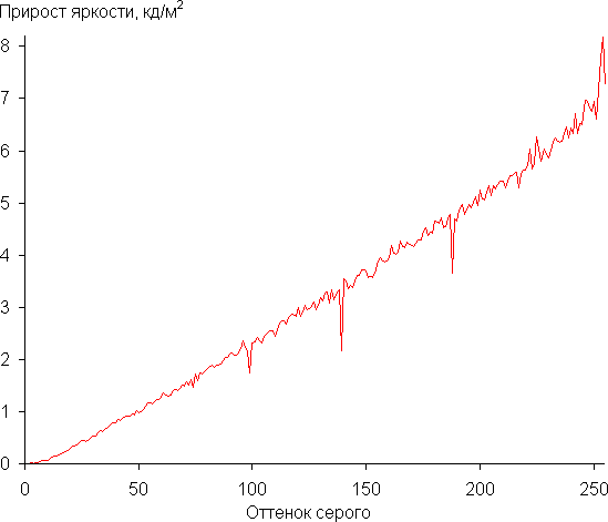 Реальная гамма-кривая ближе всего к стандартной при выборе варианта Гамма 2.2, поэтому далее мы измерили яркость 256 оттенков серого (от 0, 0, 0 до 255, 255, 255) при этом значении. График ниже показывает прирост (не абсолютное значение!) яркости между соседними полутонами:
